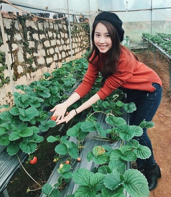 Diễn viên Huỳnh Hồng Loan thích thú thăm quan trang trại trồng dâu ở Đà Lạt.
