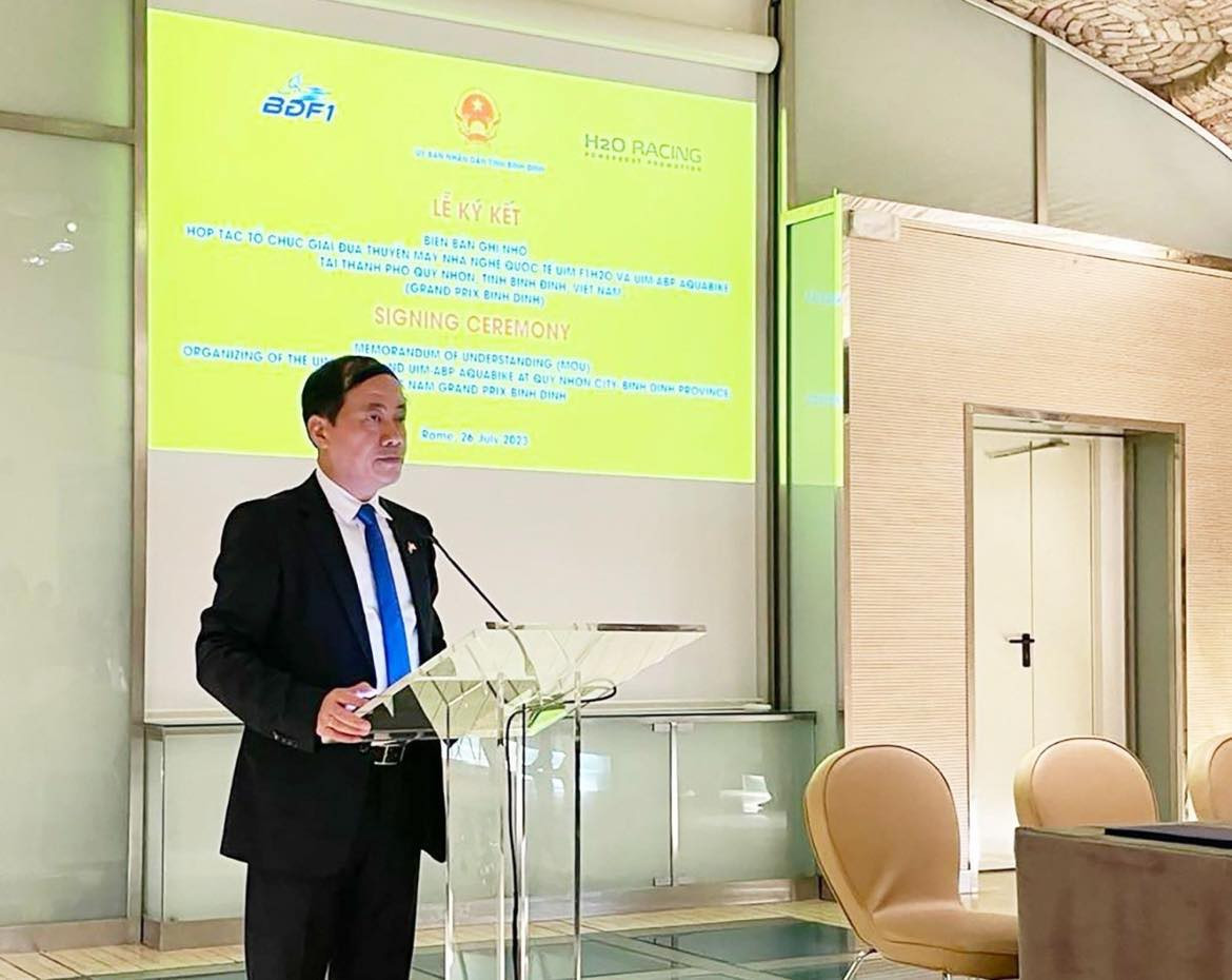 Trong chuyến tháp tùng cùng đoàn Chủ tịch nước Võ Văn Thưởng và Phu nhân thăm và làm việc tại Italy, ngày 26/7, tại Italy, Chủ tịch UBND tỉnh Bình Định Phạm Anh Tuấn cùng Công ty CP F1 Bình Định, là chi nhánh của H2O Management LTD (H20 Racing) - Đơn vị thực hiện của UIM F1H2O đã ký biên bản ghi nhớ Hợp tác tổ chức giải Đua thuyền máy Nhà nghề Quốc tế UIM F1H2O và UIM-ABP Aquabike tại TP Quy Nhơn, tỉnh Bình Định (Grand Prix Binh Dinh).