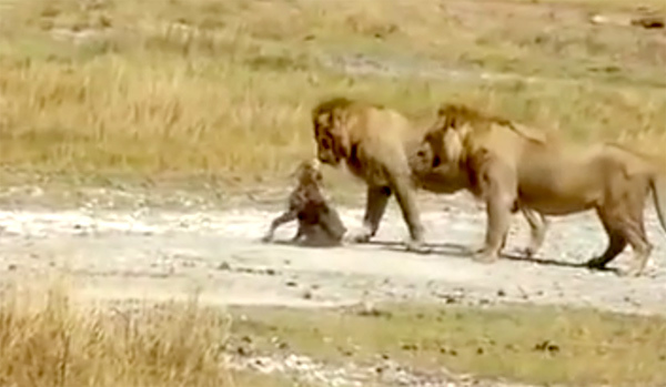 Thường thì sư tử sẽ ra đòn tàn sát linh cẩu trong tích tắc. Tuy nhiên, 2 con sư tử to lớn đã tha mạng cho con linh cẩu vì nó đang bị trọng thương.