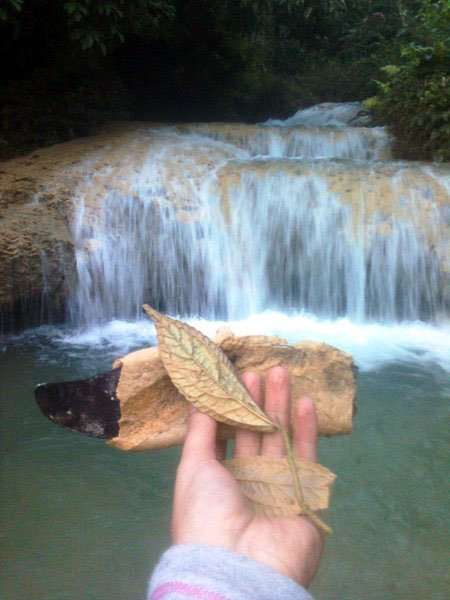 Một số lá keo hay chàm gì đó, có vẻ ngâm dưới nước đã lâu, nên lớp “đá” màu hơi sậm phủ bên ngoài dày cộp. Bẻ nhẹ, lớp bọc bên ngoài vỡ ra, lộ nguyên hình chiếc lá ngâm nước lâu ngày đen đúa. Những “hóa thạch ngàn năm” tan vụn theo từng cái siết tay, tố cáo thời gian phong hóa chẳng bao lâu.