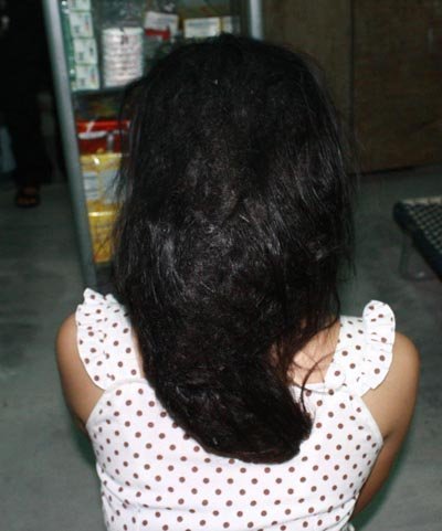 | Mái tóc chị H. kết lại với đủ hình thù kỳ dị |
