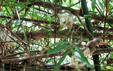 Dẫn chúng tôi vào thăm khu vườn, anh Ngân vừa chỉ tay lên ngọn cây vừa mô tả: “Dịp này đang là mùa sinh đẻ của các loài chim, chú cứ nhìn kĩ lên các rặng tre sẽ thấy vô số tổ chim. Nhiều tổ đã “ra ràng” còn thấy cả chim con ra đậu bên ngoài”.