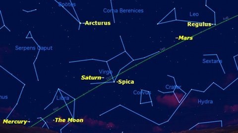 Tuy nhiên, sự thú vị chưa dừng lại tại đó. Đến khoảng 6h chiều nay (giờ Việt Nam), người dân ở một số khu vực trên thế giới sẽ có thể quan sát được nốt ba hành tinh lớn còn lại. Lúc này, đường nhật /nguyệt thực đã nghiêng theo chiều ngược lại và dọc theo nó, người ta có thể nhìn thấy sao Thủy, mặt trăng, sao Thổ và sao Hỏa. Xa xa, ở phần “phông nền” sẽ là ba trong số những ngôi sao sáng nhất: Arcturus (hay còn gọi là sao Alpha Bootes và “người giữ gấu”), Regulus (sao sáng nhất trong chùm sao Leo) và Spica (sao sáng nhất trong chùm sao Virgo). Trong đó, sao Spica nhận được sự chú ý đặc biệt, vì trong năm 2012, mặt trăng sẽ có rất nhiều dịp bay sát gần Spica, thậm chí sẽ có lần bay cắt mặt ngôi sao này. Những sự tiếp cận ở cự ly gần giữa hai vật thể không gian như vậy được gọi là giao hội. Dù ý nghĩa của chúng không quá quan trọng đối với thiên văn học hiện đại nhưng đó luôn là những hiện tượng vô cùng thú vị để quan sát.