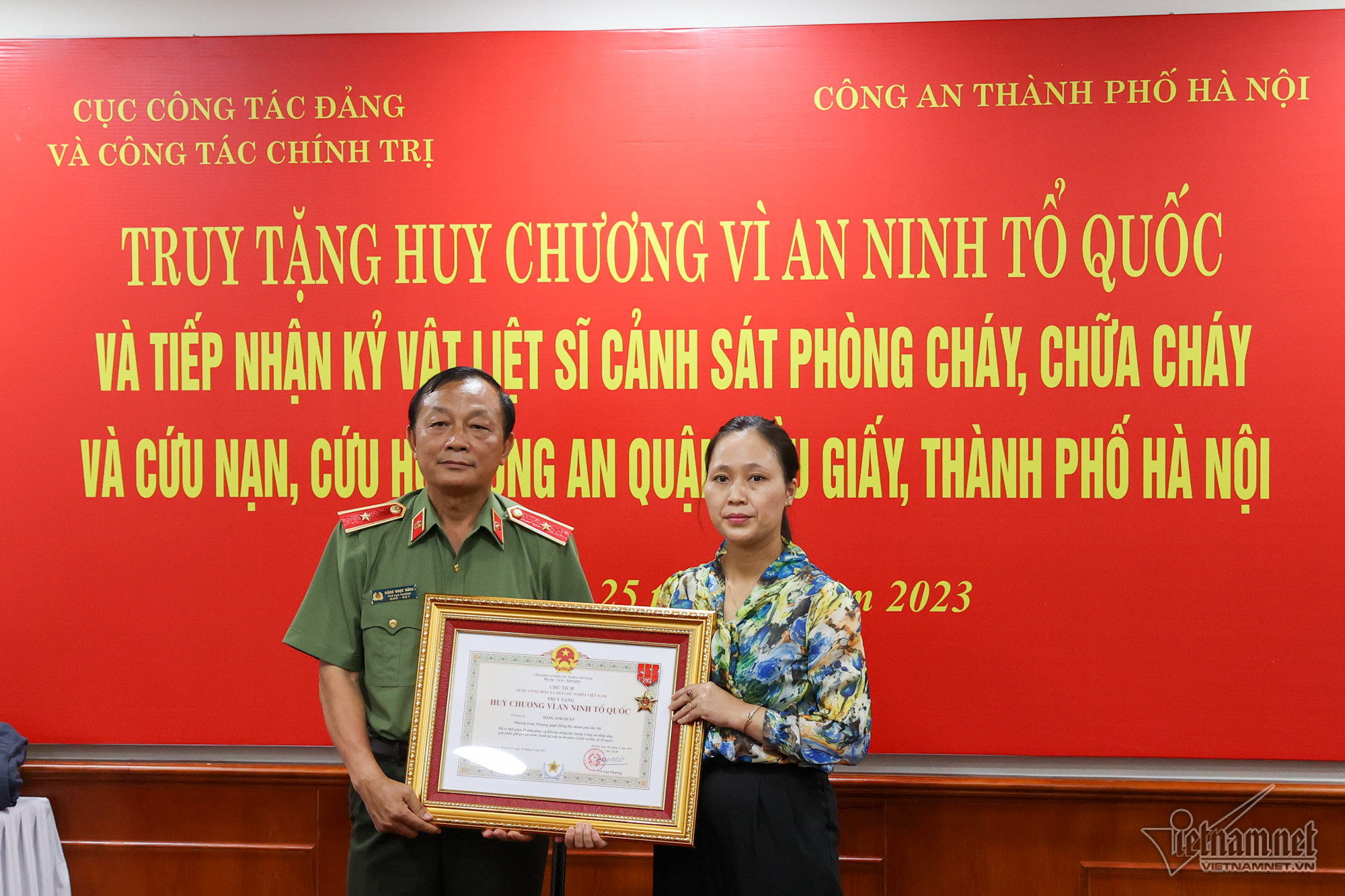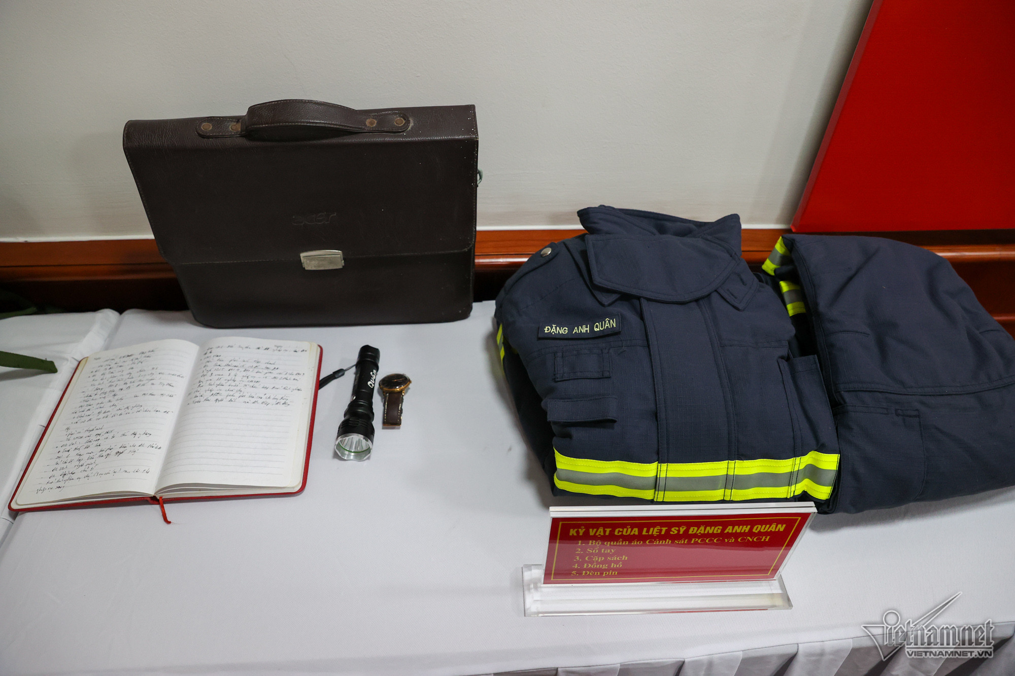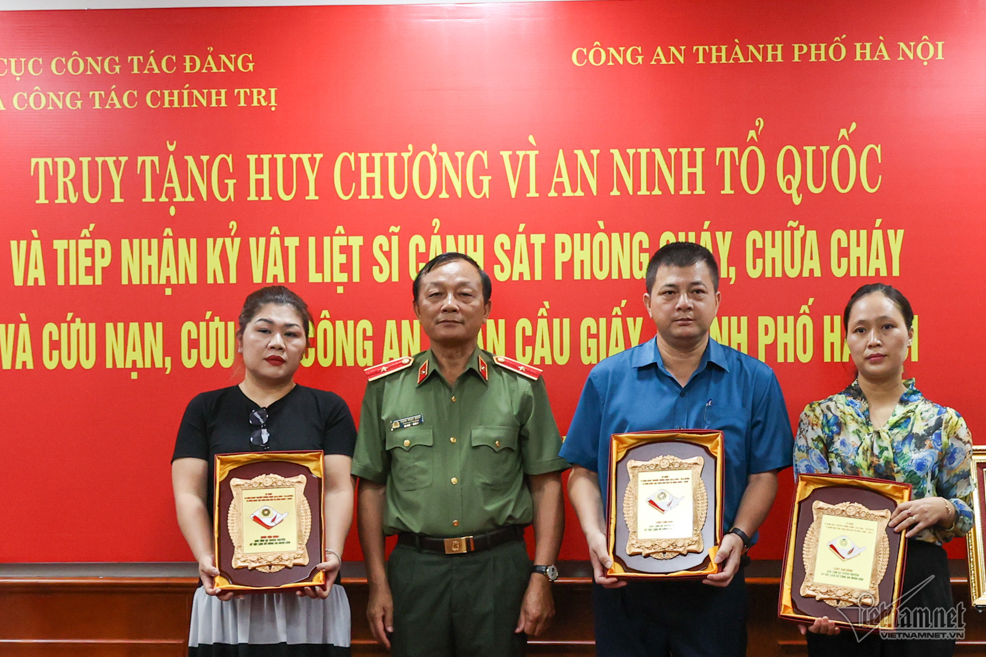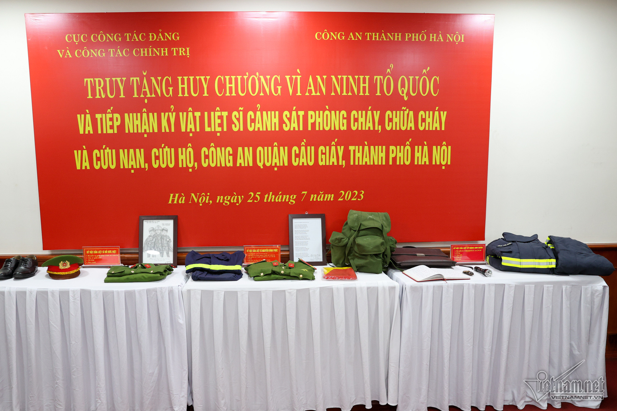 Thừa ủy quyền của Bộ Công an, Thiếu tướng Đặng Ngọc Bách đã trao Huy chương Vì an ninh Tổ quốc cho Liệt sĩ Đặng Anh Quân. Trước đó, ngày 8/6/2023, Chủ tịch nước đã ký Quyết định truy tặng Huy chương Vì an ninh Tổ quốc cho Liệt sĩ Đặng Anh Quân, đã có thành tích 25 năm phục vụ liên tục trong lực lượng CAND.Kỷ vật của Liệt sĩ Đặng Anh Quân được gia đình trao tặng Bảo tàng CAND gồm: Huy chương bảo vệ Tổ quốc, bộ quần áo Cảnh sát PCCC và CNCH; Sổ tay và chiếc cặp.Đặc biệt, trong số các kỷ vật có chiếc đèn pin và đồng hồ đeo tay - những vật dụng được Liệt sĩ Đặng Anh quân sử dụng khi tham gia chữa cháy và cứu các nạn nhân tại cơ sở karaoke thuộc phường Quan Hoa, quận Cầu Giấy ngày 1/8/2022.Kỷ vật gia đình Liệt sĩ Nguyễn Đình Phúc trao tặng gồm: Cờ Tổ quốc (phủ lên thi hài Liệt sĩ), bộ quần áo quân phục cảnh sát xuân hè; bộ quần áo Cảnh sát PCCC và CNCH và chiếc balo.Ngoài ra còn có bài thơ do đồng chí Nguyễn Đức Chính, nguyên cán bộ Công an TP Hà Nội viết tặng Liệt sĩ Nguyễn Đình Phúc ngày 7/8/2023.Kỷ vật của Liệt sĩ Đỗ Đức Việt được gia đình trao tặng gồm: Mũ Kepi cảnh sát, bộ quần áo quân phục cảnh sát xuân hè; Ve hàm sĩ quan (trung úy), giày sĩ quan.Ngoài ra còn có bức tranh của tác giả Bùi Huy Nam vẽ tặng Liệt sĩ Đỗ Đức Việt.Đây là những kỷ vật quý giá, bổ sung vào sưu tập “Kỷ vật liệt sĩ CAND” của Bảo tàng CAND - nguồn tài liệu hiện vật quan trọng - những di sản văn hóa của lực lượng CAND phục vụ trưng bày, giới thiệu về những cống hiến, hy sinh của các thế hệ cán bộ, chiến sĩ vì sự nghiệp xây dựng và bảo vệ Tổ quốc.Thiếu tướng Đặng Ngọc Bách chụp ảnh cùng thân nhân các liệt sĩ.