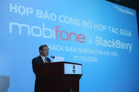 | Ông Mai Văn Bình - Tổng Giám Đốc công ty MobiFone phát biểu trước buổi họp báo ra mắt gói dịch vụ BlackBerry tại Hà Nội |