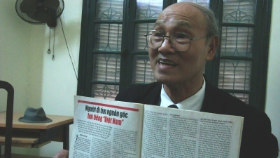 | Ông Nguyễn Phúc Giác Hải tự hào khoe bài báo viết về công trình khoa học quan trọng nhất của ông. Ảnh: Thủy Chung |