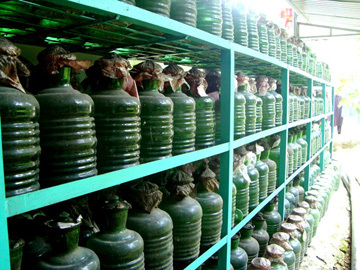 tôn che kín khoảng sân trước cửa cùng hai dãy dài kệ sắt. Hơn 1.000 bình rượu