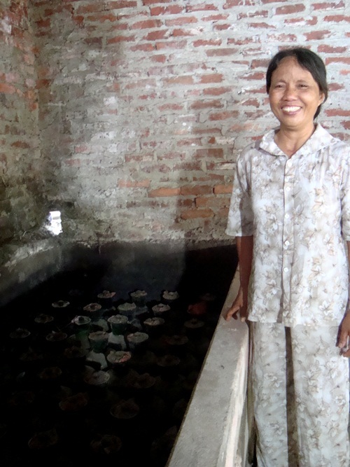 | Bà Việt, vợ ông Sỹ bên bể “nhốt” bình rượu |