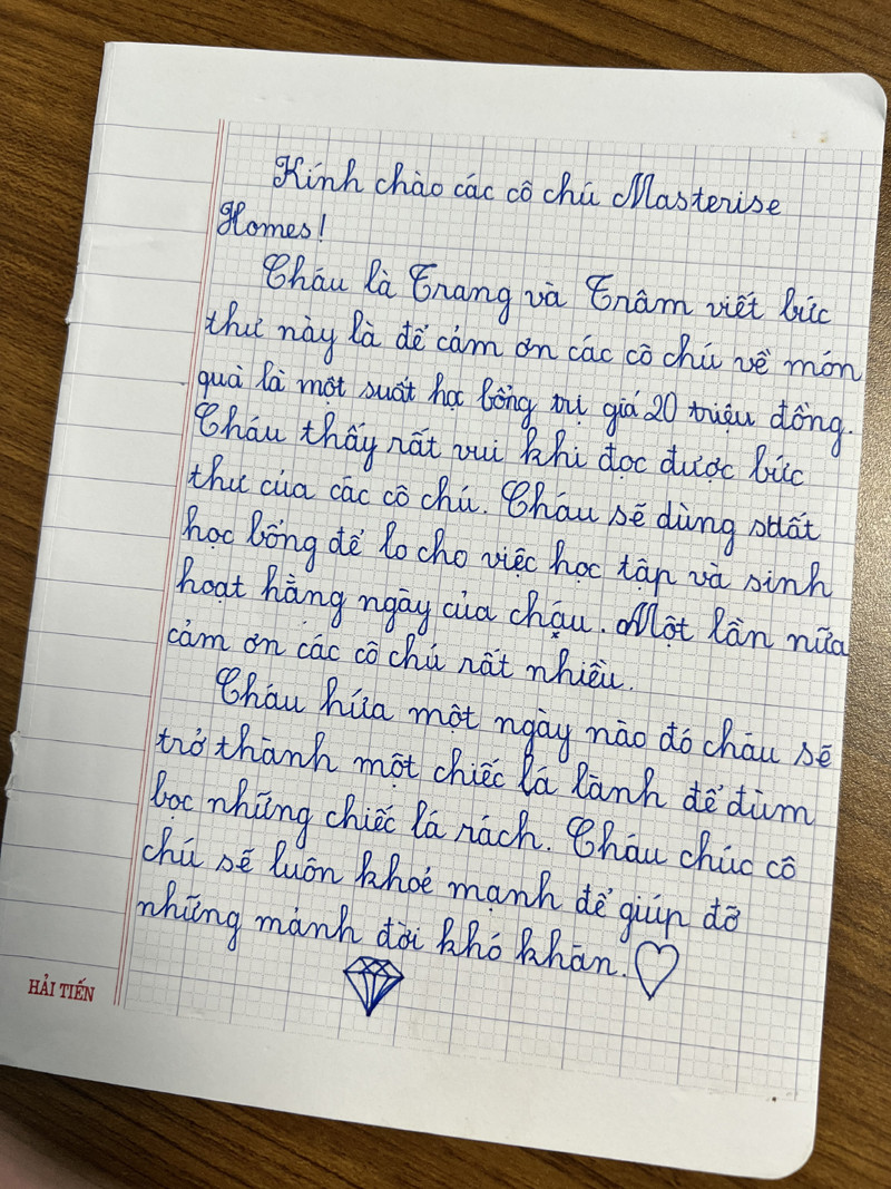 Trao tặng học bổng trị giá 20 triệu đồng để đồng hành cùng Trang vượt qua những khó khăn, Masterise Group đã gửi đến em lá thư nhiều cảm xúc.