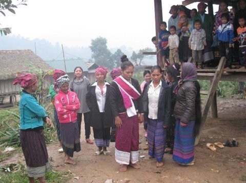 Sau đó ít phút, theo hướng dẫn của người mai mối, hai vợ chồng trẻ cùng quỳ, cúi đầu xuống chiếu, hướng tay về phía góc nhà. Trên chiếc giường là 3 người đàn ông, trong đó có một người mai mối và hai người trưởng tộc của hai họ đang bàn bạc chuyện đại sự.