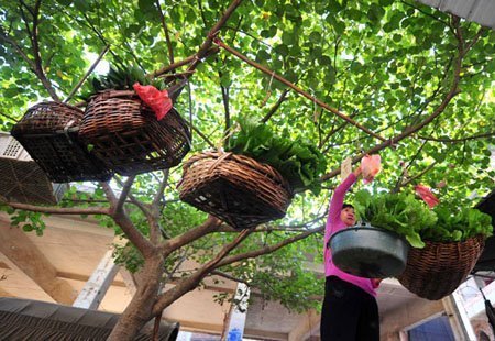 | Những mớ rau tươi ngon được treo lên cao để người mua dễ dàng lựa chọn. |