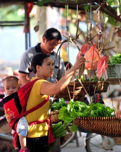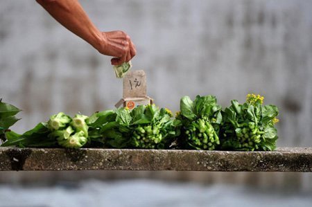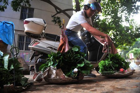 Một người dân làng đặt gánh rau xanh của mình tại khu chợ tự phục vụ trước khi đi làm việc tại trang trại ở làng Tanglang, khu tự trị dân tộc Choang, tỉnh Quảng Tây. |