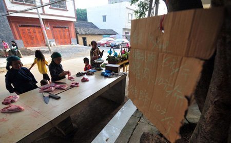 | Những khách hàng tự cắt thịt lợn và trả tiền tại khu chợ tự phục vụ ở làng Chunren, khu tự trị dân tộc Choang tỉnh Quảng Tây. |