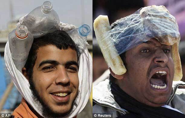Những người chống Tổng thống Ai Cập Mubarak tại quảng trường Tahrir đã dùng mọi cách có thể để bảo vệ đầu trước những cục đá bay trong cuộc chiến giữa hai phe chống và ủng hộ Tổng thống.