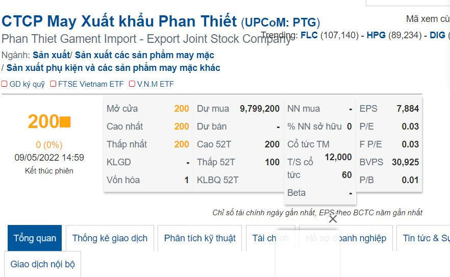 Cổ phiếu PTG của Công ty Cổ phần May xuất khẩu Phan Thiết là một trong số cổ phiếu có thị giá thấp nhất trên sàn chứng khoán, với 200 đồng/cp. Giao dịch cổ phiếu PTG gần như đóng băng trong nhiều năm qua. Gần đây nhất, phiên ngày 11/11/2021 mới có 100 đơn vị được giao dịch, mức tăng từ 100 đồng/cp lên 200 đồng/cp.