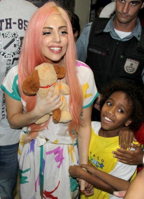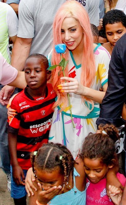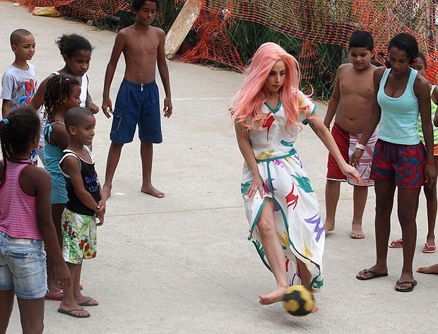 Nữ ca sĩ 26 tuổi nhuộm tóc màu hồng, sơn móng màu cam, mặc váy xẻ cao và đi chân đất đá bóng với trẻ em nghèo ở một khu ổ chuột tại Rio, Brazil.