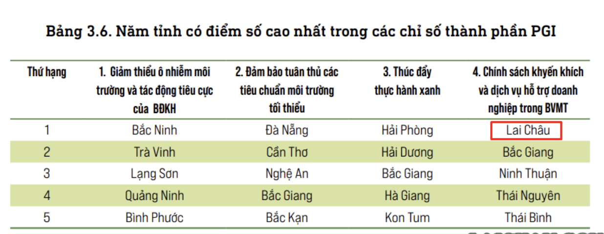 Trong đó các chỉ số xếp hạng cao gồm: Chỉ số Chính sách và dịch vụ hỗ trợ doanh nghiệp trong bảo vệ môi trường xếp thứ nhất; Chỉ số thúc đẩy thực hành xanh xếp thứ sáu.