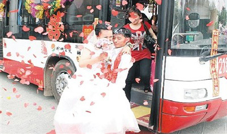 Hết dùng xe taxi, máy xúc đón dâu, mới đây một đôi uyên ương tại Trung Quốc lại nghĩ ra chiêu trang hoàng xe buýt làm phòng chờ, đợi chú rể tới "rước nàng về dinh".