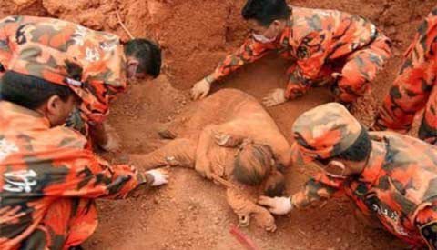 Cả đội đã cùng nhau làm việc; họ cẩn thận dỡ bỏ những cái cọc trong đống đổ nát xung quanh người phụ nữ. Có một cậu bé 3 tháng tuổi được bọc trong một chiếc chăn hoa bên dưới thi thể của người mẹ. Rõ ràng, người phụ nữ đã hy sinh để cứu con mình. Khi ngôi nhà sập, cô đã lấy thân mình làm tấm chắn bảo vệ con trai. Cậu bé vẫn đang ngủ một cách yên bình khi đội cứu hộ nhấc em lên.