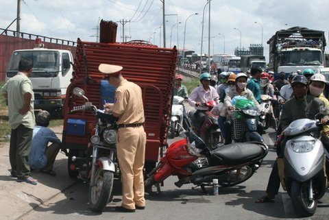Thông tin ban đầu cho biết, trong dòng xe đổ dốc cầu, xe ba bánh chở đầy dàn giáo 84H8-4287 do lái xe Nguyễn Tấn Lộc điều khiển đã đâm vào xe gắn máy 59K1-299.25 đang lưu thông phía trước.