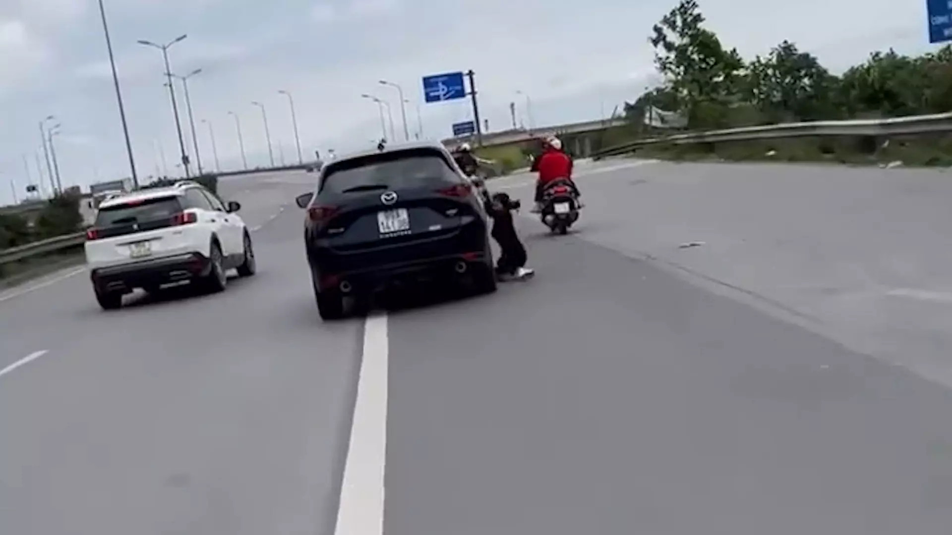 Hình ảnh trong video clip ghi lại, chiếc xe Mazda CX- 5 đang lưu thông theo hướng từ cầu Thanh Trì về Bắc Ninh thì đột ngột dừng xe bên lề đường.