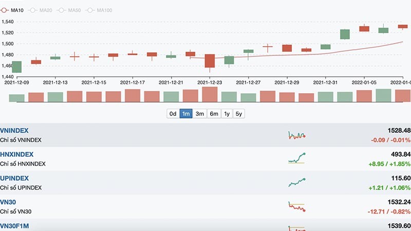 Kết thúc phiên giao dịch ngày 7/1, VN-Index đứng ở mức 1.528,48 điểm, tương ứng tăng 2,02% so với tuần trước. HNX-Index cũng tăng 4,19% lên 493,84 điểm. UPCoM-Index tăng 2,59 điểm lên 115,6 điểm.