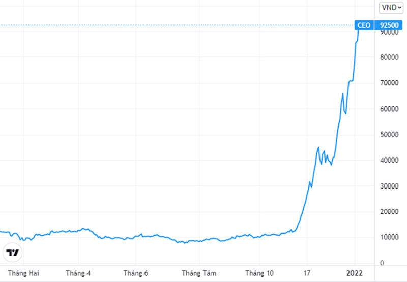 Chốt phiên giao dịch 8/1, cổ phiếu CEO niêm yết ở mức 92,5 nghìn đồng/cp. Từ một penny bất động sản, giá trị cổ phiếu của CEO tăng mạnh lên hơn 600% kể từ đầu tháng 10, gấp 9 lần lên mốc 92.500 đồng/cp. Nếu nhà đầu tư mua cổ phiếu CEO vào phiên 4/1 với mục đích "lướt sóng" cũng ghi nhận mức sinh lời 19% khi bán ra trong phiên T+3.