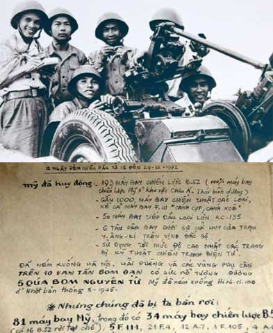 | Nhà báo Nguyễn Xuân Mai (ảnh trên, ngoài cùng bên trái) và tập bản thảo ông viết tay để Tuần báo Phòng không Không quân xuất bản khi chiến dịch 12 ngày đêm kết thúc. |