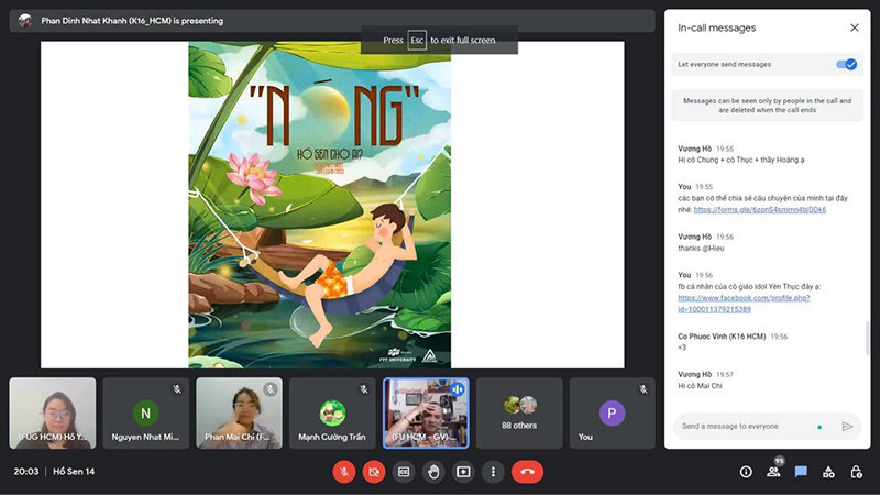 “Hồ sen chờ ai" được triển khai trực tuyến thông qua nền tảng Google Meet. Người tham gia chia sẻ trong “Hồ sen chờ ai?”, bao gồm cả thầy cô, sinh viên FPT Edu đều có thể giấu mặt. Tinh thần của “Hồ sen chờ ai?” không phải là một buổi trị liệu, tư vấn tâm lý mà đây là không gian để những người tham gia lắng nghe và chia sẻ, không phán xét.