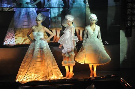 Một thiết kế tương phản giữa Đông và Tây, giữa cổ truyền và hiện đại, giữa cứng và mềm. Ý tưởng về sự tương phản này cũng thể hiện rõ nét qua màu sắc đối lập trắng - đen và cách sử dụng chất liệu trang phục: vải da được đục lỗ bằng kỹ thuật cắt laser rồi đan mây tạo họa tiết với kỹ thuật đan nong ba cổ truyền và vải lụa, các sợi tơ đan, kết theo kỹ thuật macrame tạo tua rua với những móc, khuy kim loại.