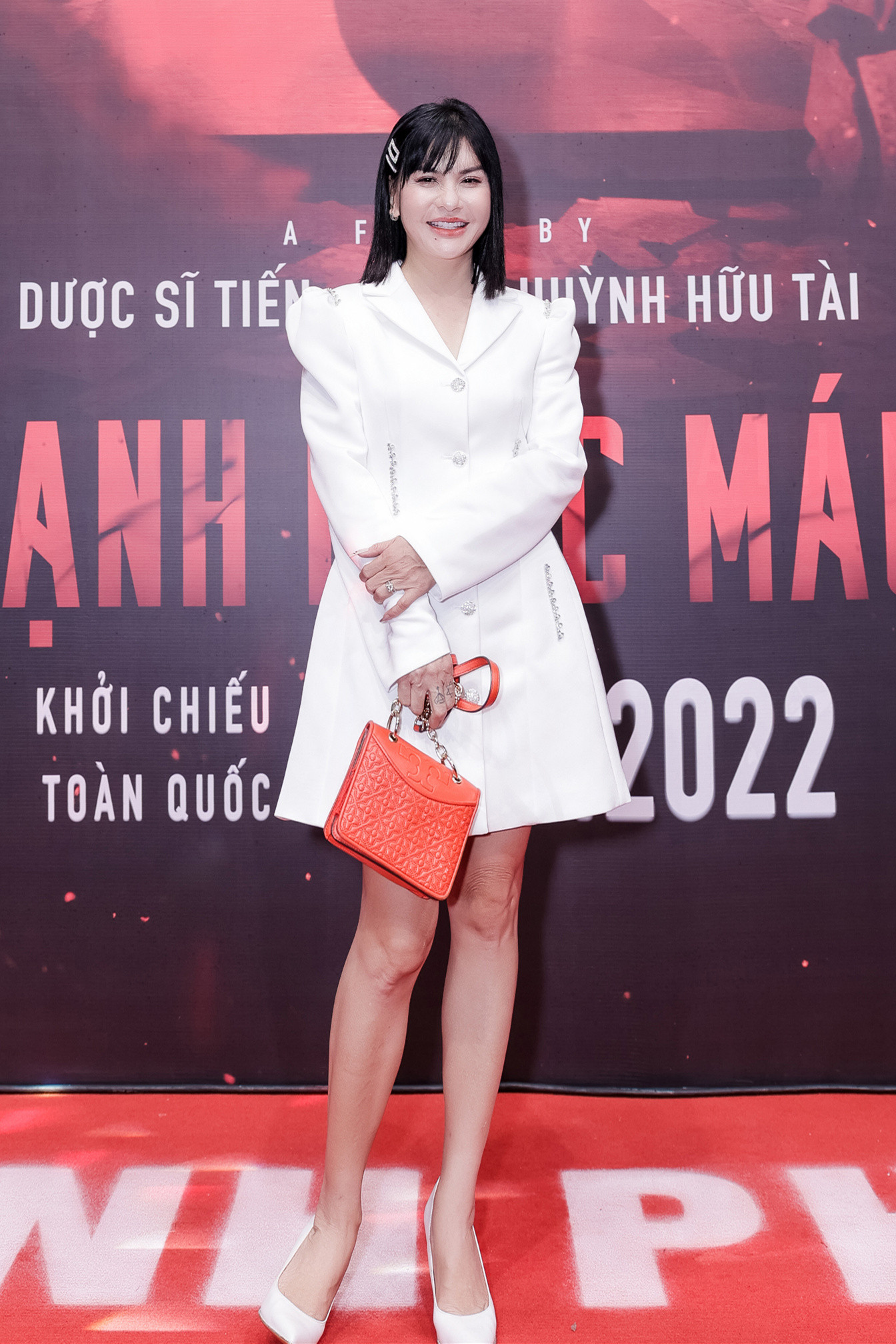 Buổi ra mắt phim "Hạnh phúc máu" quy tụ gần 1.000 khách mời tham dự. Dàn diễn viên trong phim tề tựu đông đủ. Nhà sản xuất kiêm diễn viên nam chính Dược Sĩ Tiến mặc lịch lãm.NSND Kim Xuân - nhân vật trung tâm của bộ phim - chụp cùng nhà sản xuất kiêm diễn viên nam chính Phạm Huỳnh Hữu Tài. Trong phim, hai người đóng vai mẹ con, cùng sống trong căn biệt thự của gia tộc Vương Đình ở Đà Lạt.NSND Kim Xuân chia sẻ cảm xúc hạnh phúc. Bà không nghĩ mình sẽ có vai chính ở tuổi 66. Trong phim, Kim Xuân vào vai Madame Hà Phương - người duy trì đức tin kỳ lạ về sự thịnh vượng của gia tộc Vương Đình.Hai nhà sản xuất kiêm diễn viên chính Dược Sĩ Tiến và Phạm Huỳnh Hữu Tài. Cả hai vào vai cặp anh em Vĩnh An - Thái Phong với số phận trớ trêu. Sau khi phim "Hạnh phúc máu" hoàn thành buổi công chiếu, Phạm Huỳnh Hữu Tài ôm lấy cựu mẫu Trang Trần khóc nức nở.NSƯT Lê Thiện rạng rỡ trên thảm đỏ. Bà vào vai mẹ chồng của NSND Kim Xuân - người tiền nhiệm duy trì nghi lễ huyền bí của gia tộc Vương Đình.Cựu mẫu Trang Trần chụp ảnh lưu niệm với ô gạch có tên mình. Trong phim, chị vào vai Kim Thiền - con gái lớn đa đoan của gia tộc Vương Đình. Vợ chồng "O Sen" Ngọc Mai - Quốc Nghiệp cũng chụp ảnh lưu niệm với ô gạch khắc tên mình. Chị là 1 trong 16 nghệ sĩ thể hiện ca khúc "Hạnh phúc máu" quảng bá cho bộ phim cùng tên. NSND Hồng Vân mặc cây đen, tạo điểm nhấn bằng chuỗi ngọc trai quanh cổ.Nghệ sĩ Cát Phượng mặc đầm thanh lịch, lẻ bóng dự sự kiện.Diễn viên Diễm My 9X khá mờ nhạt bởi trang phục thiếu điểm nhấn. Siêu mẫu Hà Anh mặc xuyên thấu, khoe vòng 1 đầy đặn, gợi cảm.Ca sĩ Lâm Khánh Chi xuất hiện với nhan sắc khác lạ. Chị vừa thực hiện phẫu thuật dây thanh quản để giọng nói nữ tính hơn.Ca sĩ Giang Hồng Ngọc đầu tư set hàng hiệu đi thảm đỏ "Hạnh phúc máu".MC Liêu Hà Trinh thanh lịch dự sự kiện một mình, không có ông xã đi cùng.