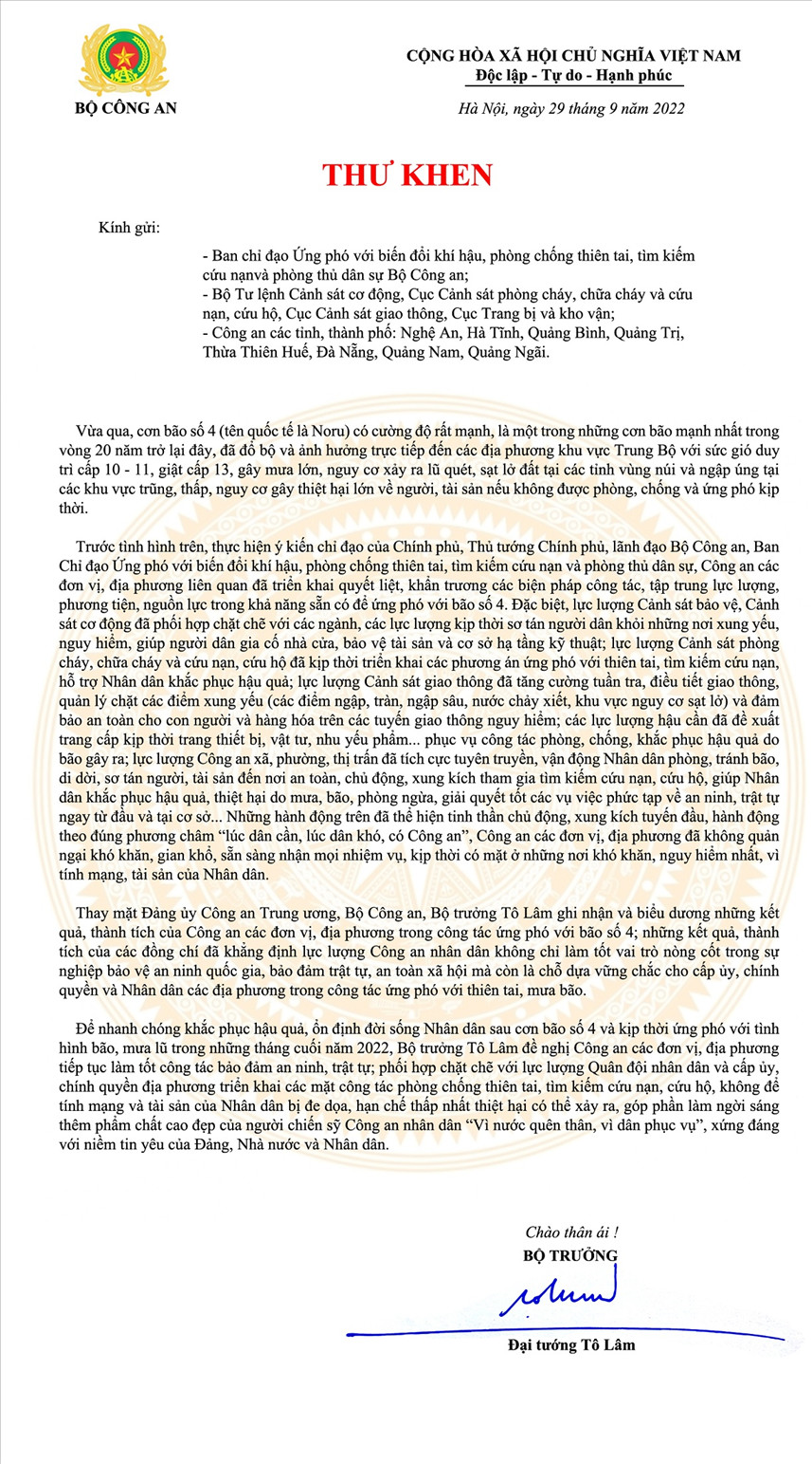 Ngày 29/9, Đại tướng Tô Lâm, Ủy viên Bộ Chính trị, Bí thư Đảng ủy Công an Trung ương, Bộ trưởng Bộ Công an có Thư khen gửi Ban Chỉ đạo Ứng phó với biến đổi khí hậu, phòng chống thiên tai, tìm kiếm cứu nạn và phòng thủ dân sự Bộ Công an; Bộ Tư lệnh Cảnh sát cơ động, Cục Cảnh sát phòng cháy, chữa cháy và cứu nạn, cứu hộ, Cục Cảnh sát giao thông, Cục Trang bị và kho vận; Công an các tỉnh, thành phố: Nghệ An, Hà Tĩnh, Quảng Bình, Quảng Trị, Thừa Thiên Huế, Đà Nẵng, Quảng Nam, Quảng Ngãi.