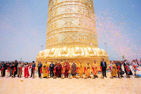 Đại bảo tháp Kinh luân làm bằng đồng tinh khiết, mạ vàng 24k với trọng lượng 200 tấn, chiều cao 37,22 m, đường kính 16,53 m.