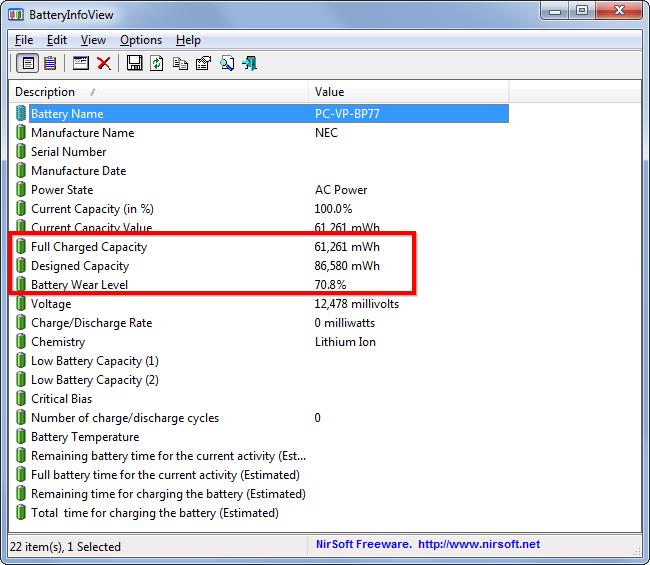 Nếu bạn tò mò muốn biết công suất pin trên laptop đã hao mòn đến mức nào, bạn có thể dùng một công cụ của bên thứ ba để kiểm tra nguồn năng lượng có trong pin laptop. Phần mềm miễm phí BatteryInfoViewcủa hãng NirSoft có thể làm được điều này, phần mềm cho phép hiển thị các mức độ công suất của pin, công suất ban đầu của pin và công suất hiện có của pin.