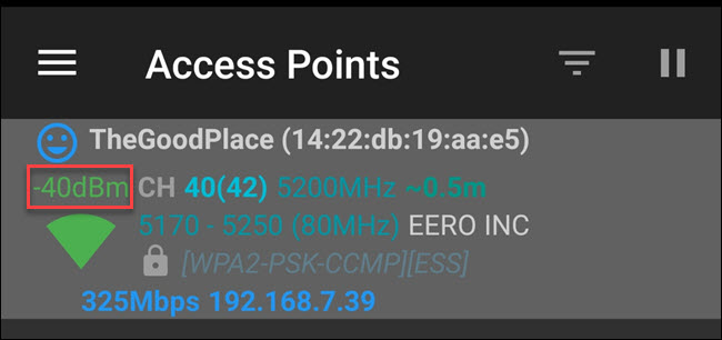 Điểm đầu tiên bạn cần lưu ý là phép đo này dùng thang đo âm. Các chỉ số sẽ chạy từ -30 đến -90. Nếu chỉ số của thiết bị ở mức -30 thì bạn đang có một "kết nối hoàn hảo", còn nếu là -90 thì tín hiệu đang rất yếu và chập chờn, bạn có thể mất kết nối tới mạng này. Tuy nhiên, con số đẹp nhất đủ đáp ứng cho mọi trường hợp dùng internet là từ -50 dBm cho đến -60 dBm, bạn có thể truyền phát, xử lí các cuộc gọi thoại hoặc bất kì thứ gì bạn muốn ở mức tín hiệu này.