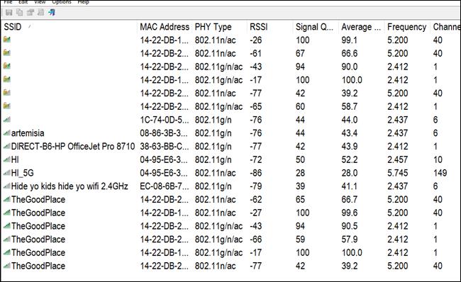 Trên Windows 10 thì bạn không thể sử dụng các ứng dụng trên mà phải thông qua một chương trình có tên gọi WifiInfoView, được phát triển bởi NirSoft. Chương trình này hoàn toàn miễn phí và rất dễ cài đặt, chỉ cần down về, giải nén, nhấn đúp vào file .EXE để cài đặt. Và cuối cùng là chạy chương trình để xem kết quả như ảnh bên dưới.
