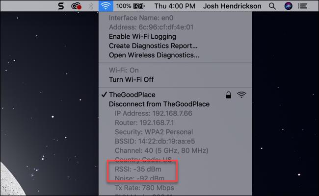 Với các thiết bị MacOS, bạn sẽ không cần phải tải xuống bất kì chương trình hoặc ứng dụng nào để kiểm tra. Chỉ cần giữ phím tùy chọn, sau đó nhấp vào biểu tượng Wi-Fi. Bạn sẽ thấy ngay các thông số của mạng đang truy cập.