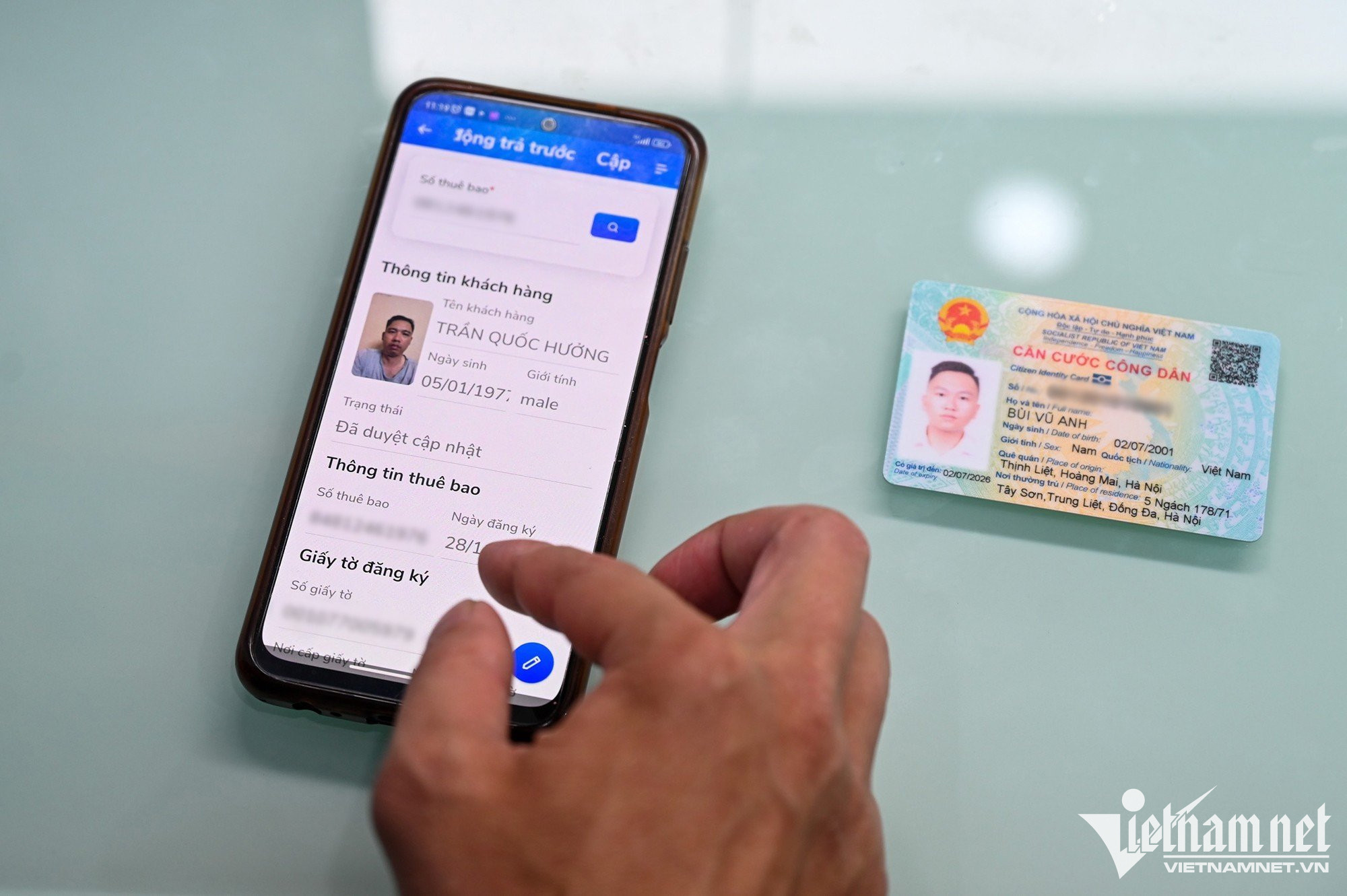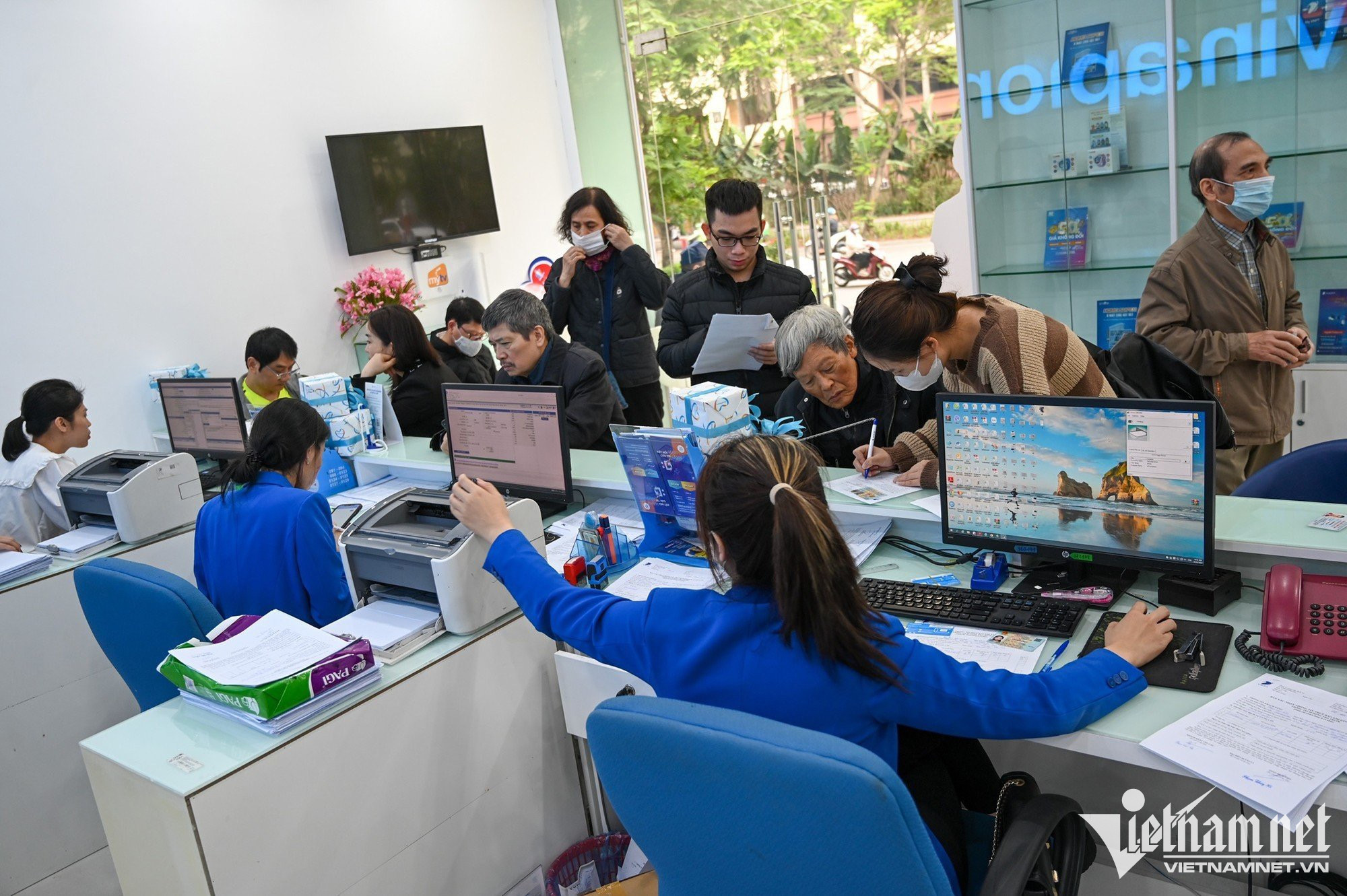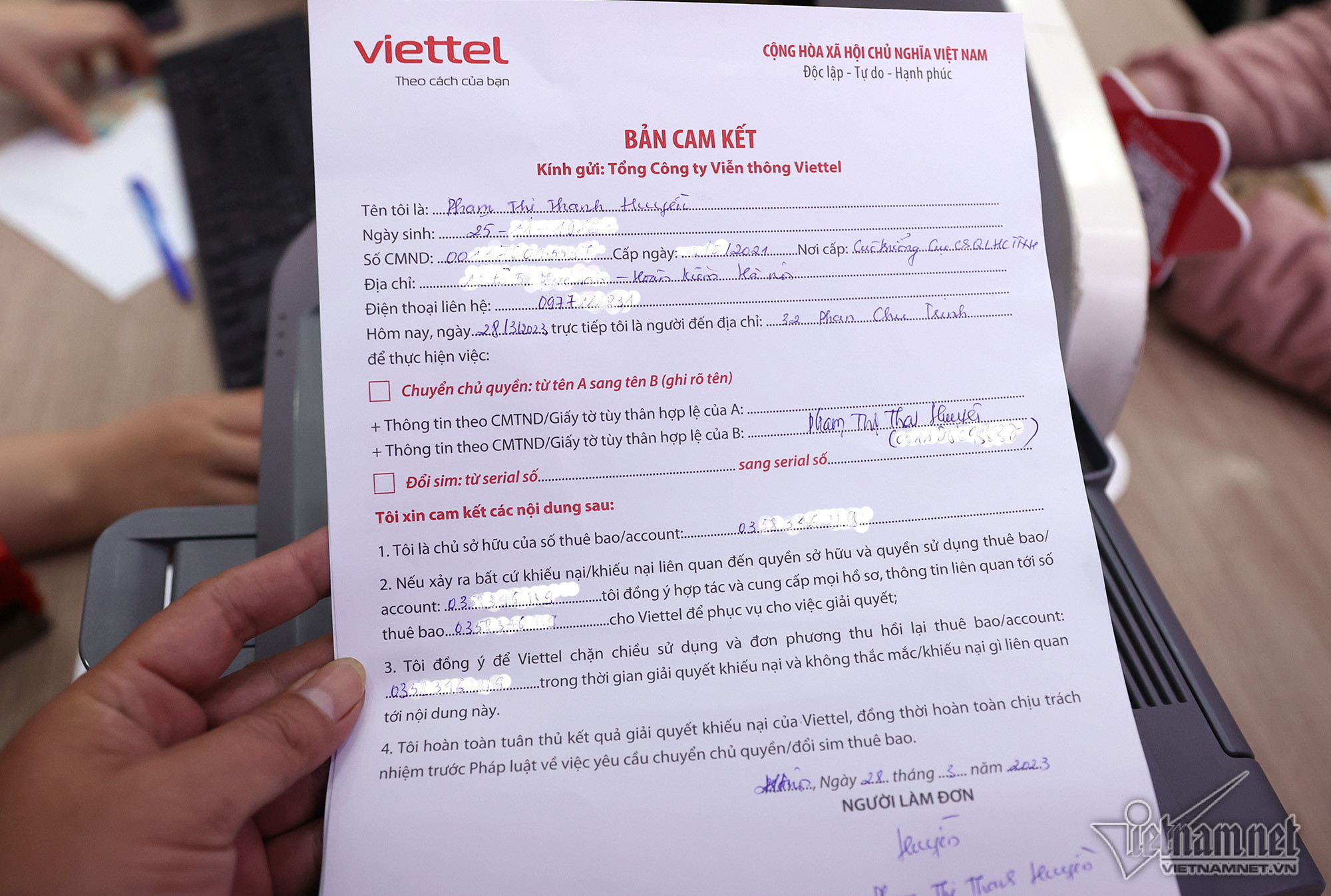 Cửa hàng dịch vụ viễn thông Viettel ở phố Phan Chu Trinh (Hà Nội) phục vụ từ 120 - 150 khách hàng, tăng 4 lần so với bình thường.Chị Phạm Thị Thanh Huyền (quận Hoàn Kiếm) được nhân viên Viettel hướng dẫn các thủ tục để đăng ký chính chủ thuê bao số điện thoại. Chị cho biết, số thuê bao điện thoại của mẹ chị (83 tuổi) nhận được tin nhắn từ nhà mạng yêu cầu đến chuẩn hoá dữ liệu, do đó chị phải mang điện thoại của bà đến đây làm thay. Vì số điện thoại mua ở cửa hàng phân phối ngoài thị trường, chưa đăng ký chính chủ thuê bao sau thời gian dài sử dụng, chị Huyền phải cam kết là chủ sở hữu số điện thoại nói trên mới đủ các thủ tục đứng tên.Sau khi điền đầy đủ các thủ tục, chị Huyền được chụp ảnh lưu hồ sơ. Do mẹ chị tuổi cao, chị quyết định đứng tên chính chủ số thuê bao mà bà cụ 83 tuổi đang sử dụng.Chị Hoàng Thị Dung (quê Thanh Hoá) cho biết, số điện thoại của chị dùng từ năm 2010 đến nay. Sau khi đọc được thông tin trên báo đài về việc thuê bao không chính chủ sẽ bị khoá, chị liền tranh thủ đến làm các thủ tục để được dùng hợp lệ.Bà Nguyễn Thị Tĩnh (quận Hoàn Kiếm) đến cập nhật CCCD gắn chíp mới. Trước đây, số thuê bao của bà đăng ký bằng CMND 9 số. Ngoài chụp ảnh chân dung, người phụ nữ cao tuổi còn được thực hiện ký chữ ký số để lưu hồ sơ.Bà Tĩnh kiểm tra lại thông tin nhà mạng gửi tin nhắn về số điện thoại sau khi chuẩn hoá thông tin thuê bao.Cửa hàng giao dịch Vinaphone tại phố Huỳnh Thúc Kháng (quận Đống Đa) ghi nhận hàng chục người xếp hàng chờ đến lượt làm thủ tục chuẩn hoá thông tin thuê bao theo yêu cầu của Chính phủ. Anh Bùi Vũ Anh (quận Đống Đa) sau khi nhận được thông báo chuyển hoá thông tin mới kiểm tra thông tin cá nhân trên ứng dụng, nhưng bất ngờ hiện ra thông tin người khác là chủ số sim điện thoại. Tại cửa hàng giao dịch cũng xuất hiện nhiều trường hợp giống anh Vũ Anh do mua sim trôi nổi bên ngoài thị trường. “Ban đầu khá lo lắng vì thấy đây không phải thuê bao chính chủ của mình sợ ảnh hưởng đến thông tin cá nhân nên tôi phải đến nhà mạng để làm lại luôn”, anh nói.Người dân phải trải qua đầy đủ các quy trình cơ bản của việc chuẩn hoá thông tin như kê khai thông tin, chụp ảnh căn cước và ảnh cá nhân. Sau khi nghe thông tin nếu không chuẩn hoá thông tin sẽ có nguy cơ bị khoá thuê bao, anh Phan Văn Đức (21 tuổi) sắp xếp thời gian đến để làm lại tới 5 số điện thoại. “Cũng không phức tạp lắm chỉ mất thời gian chờ đợi. Tôi mất khoảng 30 phút để hoàn thành thủ tục”, anh chia sẻ. Không chỉ chuẩn hoá thông tin để trùng khớp với cơ sở dữ liệu quốc gia, người dân còn được hỗ trợ đổi phôi sim theo thông tin cá nhân ban đầu.“Để tránh thời gian đợi chờ, 11h tôi mới bắt đầu đi làm, lúc này đỡ đông hơn. Thủ tục khá nhanh gọn chỉ mất khoảng 1-2 phút nhưng hơi bất tiện, do phải chụp ảnh cá nhân và căn cước tôi đã không thể làm thủ tục hộ người thân”, chị Lan chia sẻ. Đến nay, đã có 1,63 triệu thuê bao thực hiện chuẩn hóa thông tin để trùng khớp với Cơ sở dữ liệu quốc gia về dân cư, chiếm 42,4% tổng số thuê bao mà các doanh nghiệp đã xác định. Để đẩy nhanh tiến độ, một số nhà mạng đã tăng cường nhân sự tại các điểm giao dịch, đồng thời kéo dài thời gian làm việc tới 21h hàng ngày để phục vụ khách hàng.