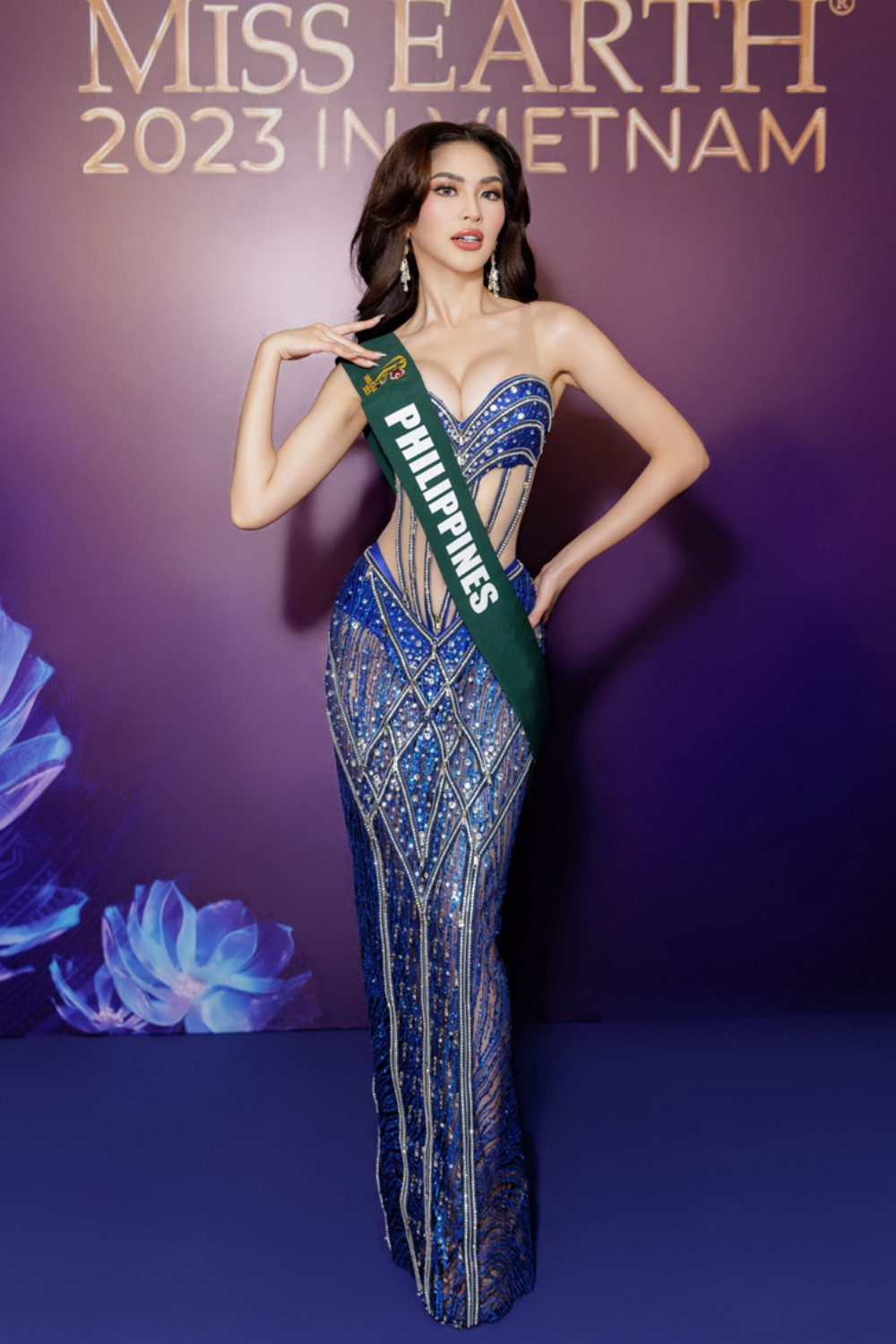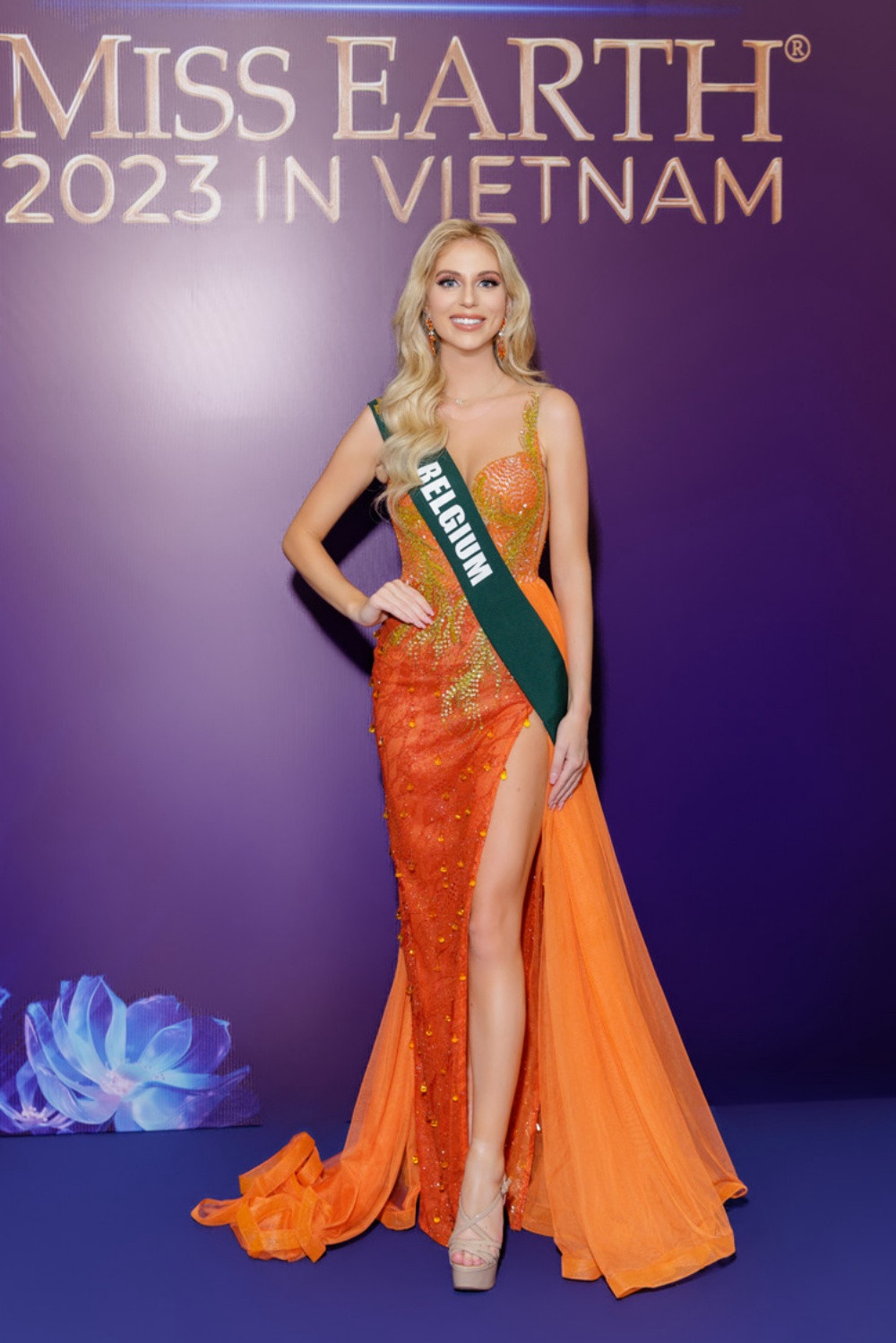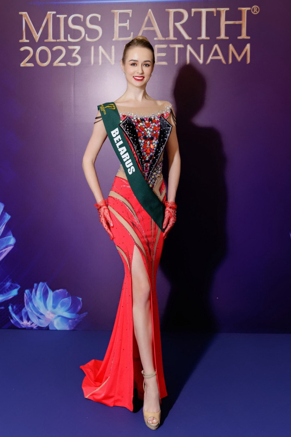 Hoa hậu Belarus - Karyna Kisialiova chọn màu đỏ cho trang phục với các chi tiết cắt xẻ tinh tế tôn đường cong và chiếc bao tay cùng màu tạo nét quý phái. Chi tiết ở giữa thân váy được thiết kế như nếp gấp của chiếc vest lạ mắt. Miss Earth Brazil - Morgana Carlos nổi bật với chiếc đầm đính đá toàn thân được cut-out ngay ngực tạo điểm nhấn. Nhiều chiếc vòng cổ bản to được xếp chồng lên nhau và liền màu với trang phục. Đại diện Philippines - Yllana Aduana để tóc bồng bềnh được làm phồng đẹp mắt, diện đầm cúp ngực, ôm sát gợi cảm, khoe khéo eo thon qua chất liệu xuyên thấu ở phần vòng 2.
