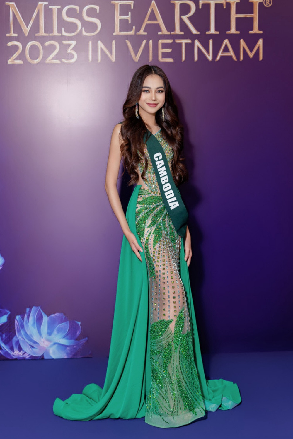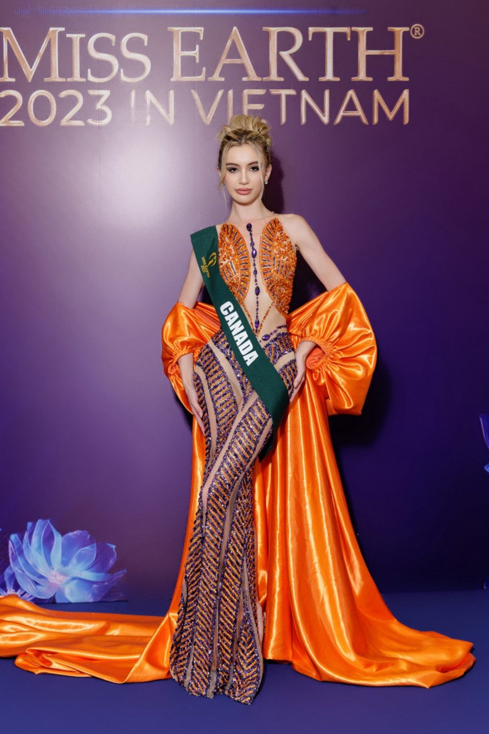 Đại diện Canada, Bỉ - Layanna Robinson và Jolien Pede chọn đầm dạ hội mang sắc cam, giúp nổi bật thêm làn da trắng sứ. Pouvjessica Tan - Hoa hậu Campuchia diện đầm tà dài màu xanh lá, đúng với chủ đề của cuộc thi.