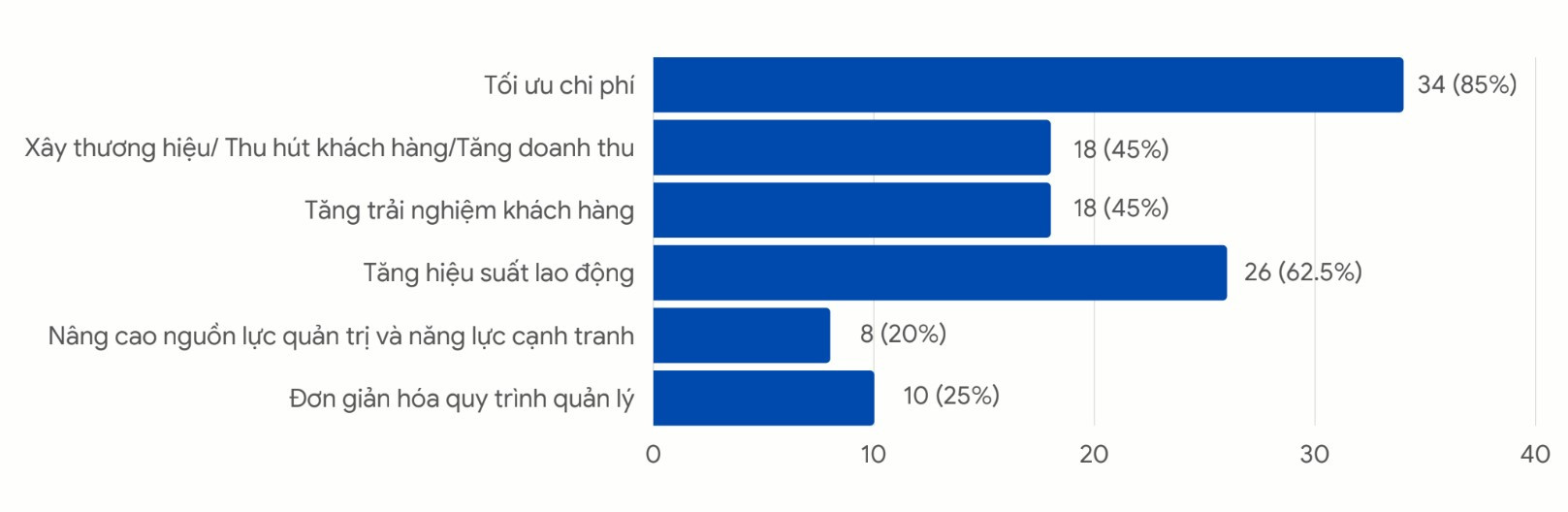 Đối với ngành gỗ Việt Nam, 3 mục tiêu chính mà các doanh nghiệp trong ngành ưu tiên hướng đến khi chuyển đổi số là tối ưu chi phí (85%), tăng năng suất lao động (62,5%) và xây dựng thương hiệu, tăng doanh thu, trải nghiệm khách hàng (45%).