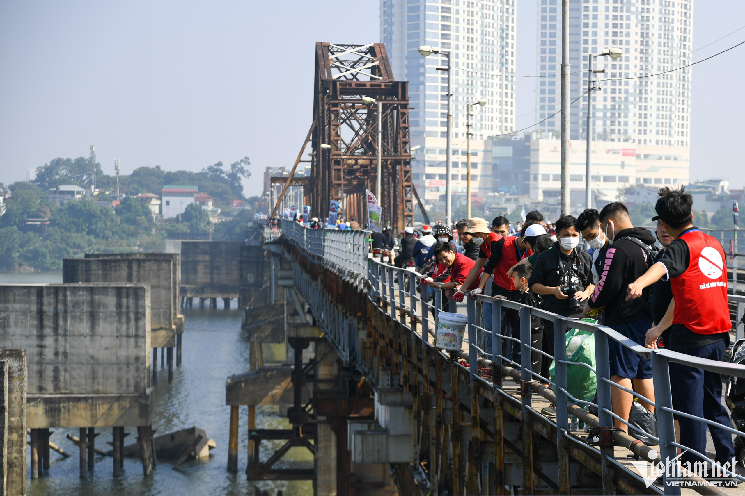 Sáng 14/1 (23 tháng Chạp) hàng nghìn người Hà Nội đổ về các sông, hồ để thả cá tiễn Táo quân chầu trời. Như thường lệ, cầu Long Biên là một trong những địa điểm tụ tập đông nhất.