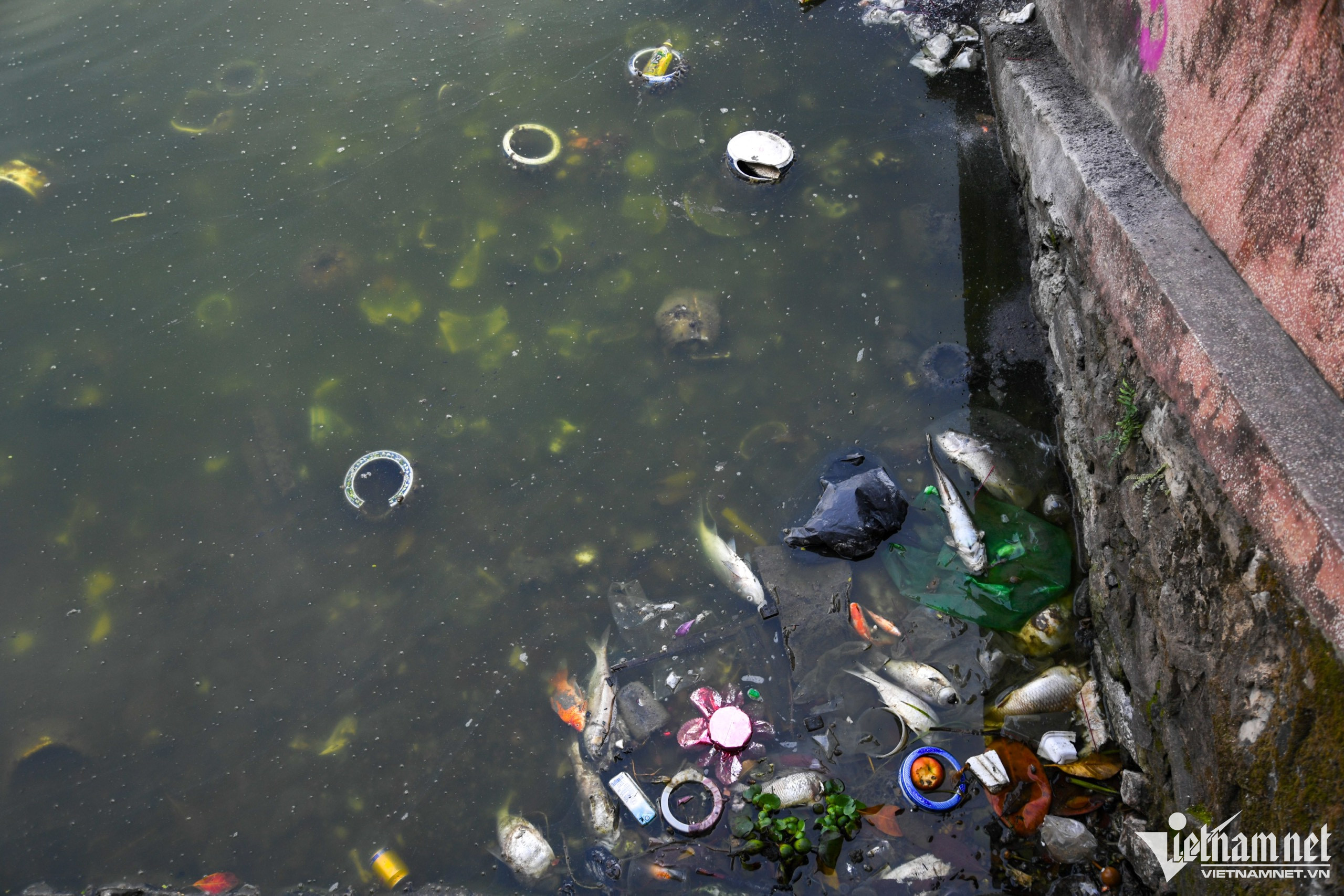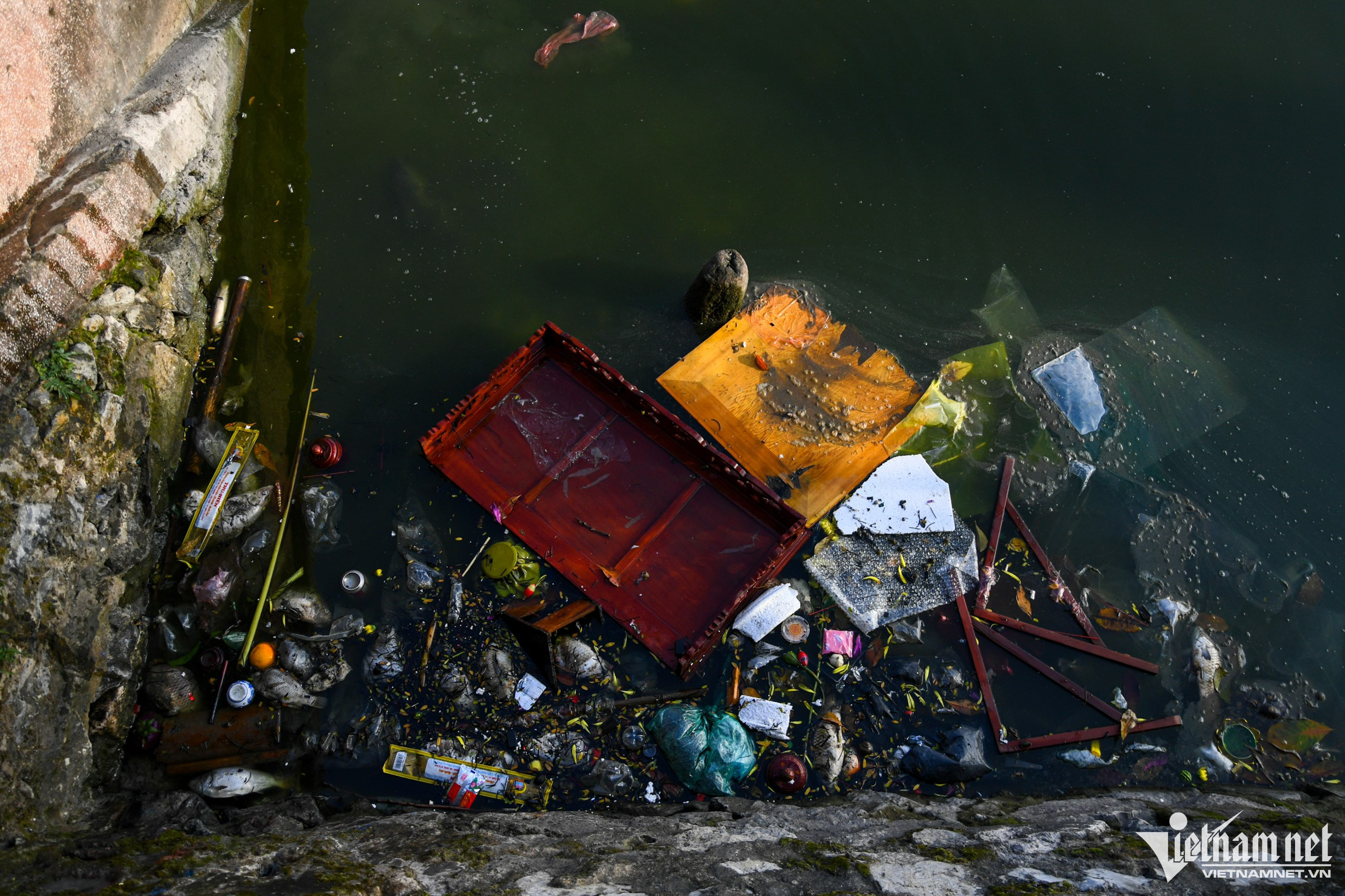 Cá chép đỏ chết nổi lềnh bềnh, nhiều người vẫn xả tro, chân hương từ trên cầu xuống sông. Ảnh: Hùng Nguyễn Việt.