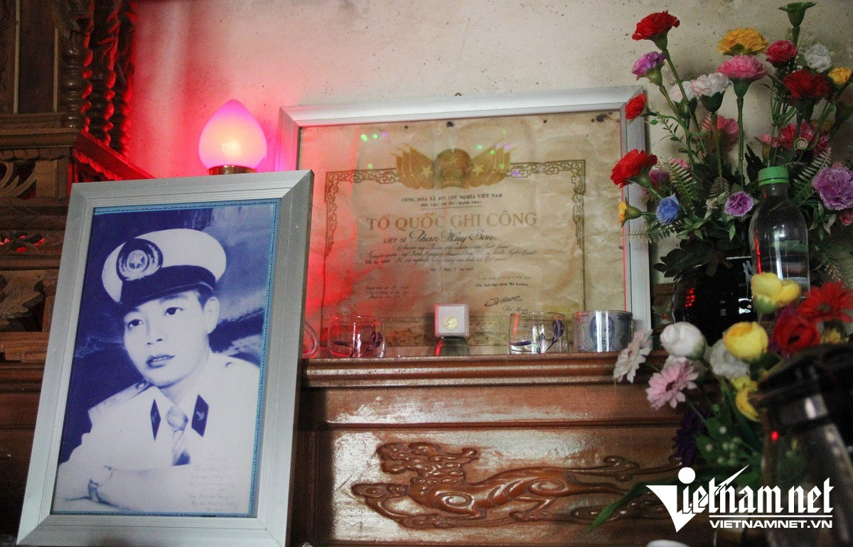 Di ảnh liệt sĩ Sơn và tấm bằng Tổ quốc ghi công trên bàn thờ gia đình.Bà Ninh sửa soạn lại bàn thờ liệt sĩ Phan Huy Sơn.