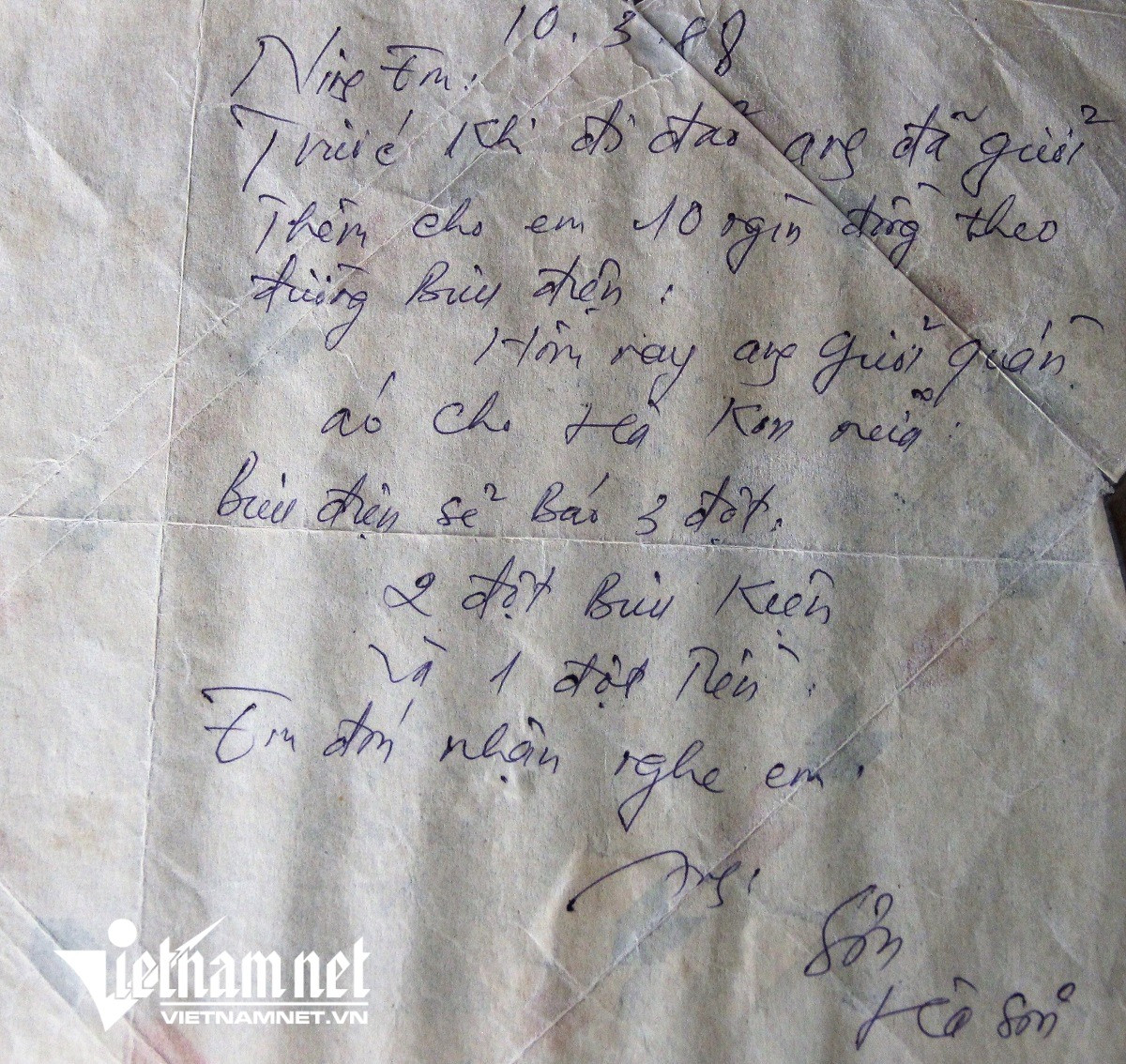 Còn trên lá thư cuối cùng vào ngày 10/3/1988 trước khi ra đảo, ông Sơn viết vội: “Ninh em! Trước khi đi đảo anh đã gửi thêm cho em 10 ngàn đồng theo đường bưu điện. Hôm nay anh gửi quần áo cho Hà con nữa (Phan Huy Hà, con trai – PV). Bưu điện sẽ báo 3 đợt, 2 đợt bưu kiện và 1 đợt tiền. Em đón nhận nghe em”.