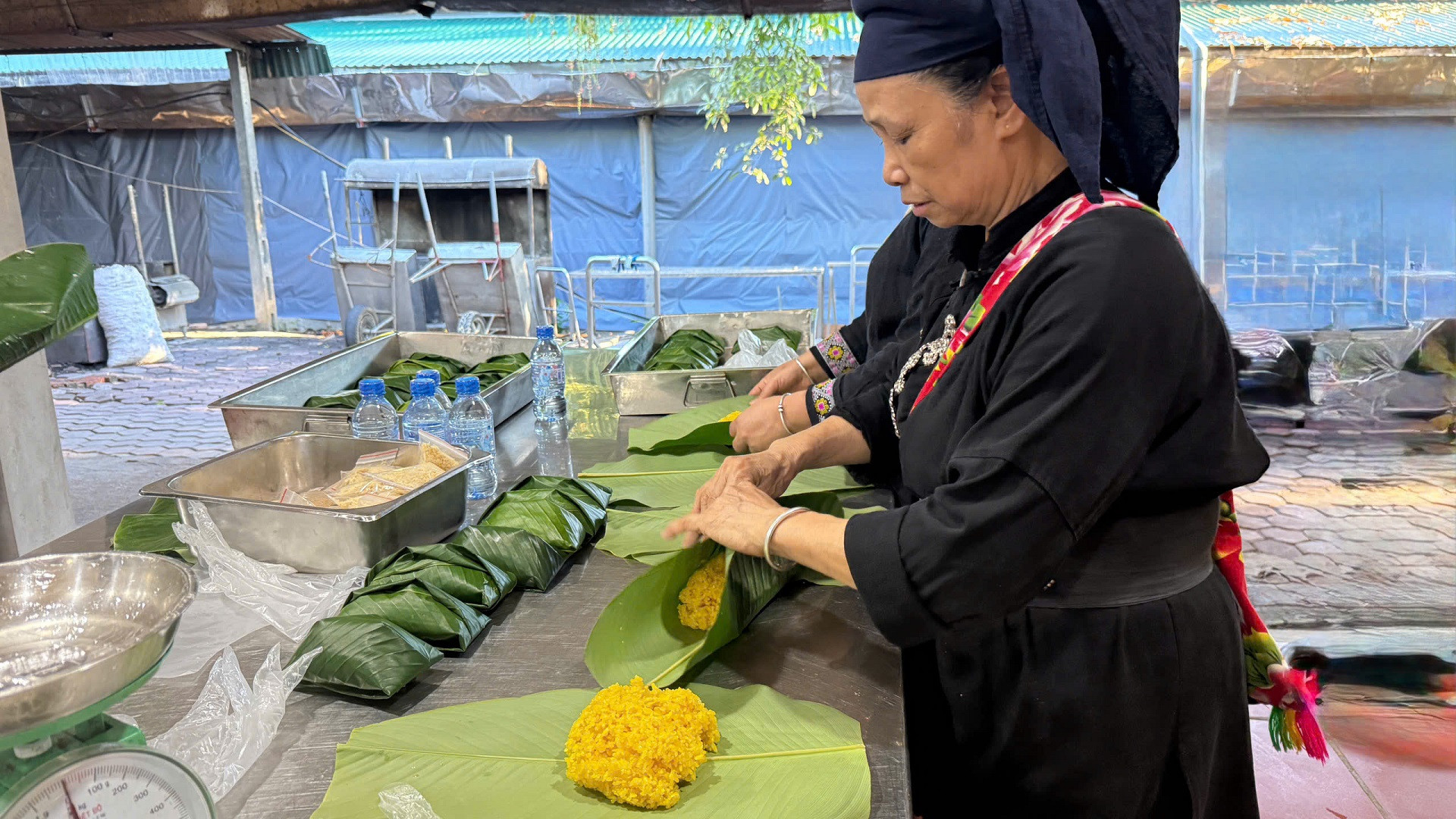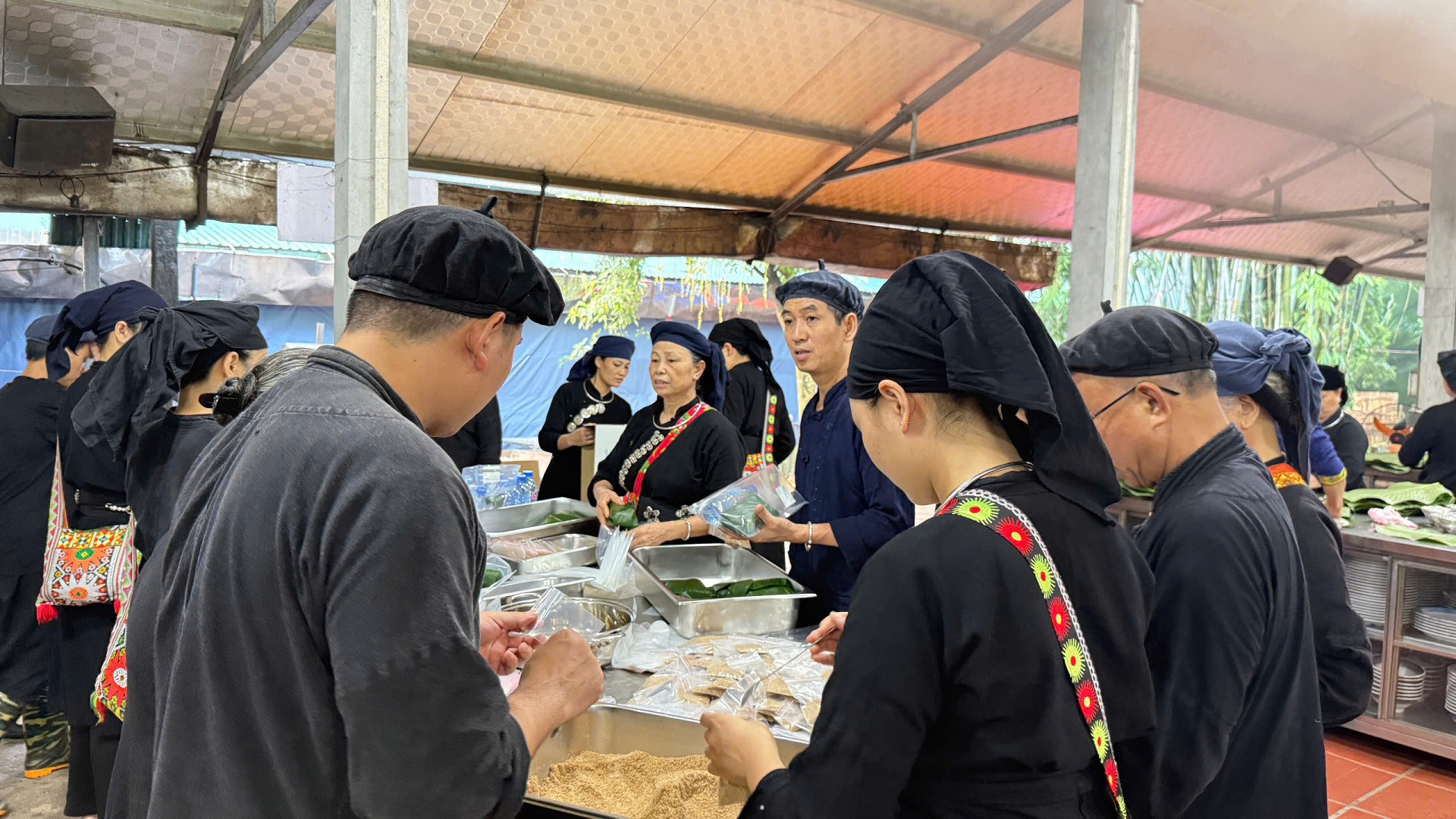 5h, căn bếp tổng của làng du lịch Thái Hải (Thái Nguyên) đã bắt đầu tấp nập. Hơn 200 người dân của làng đều tập trung ở đây, mỗi người mỗi việc. Đàn ông khỏe mạnh thì lo thịt lợn. Phụ nữ thì thổi cơm, đồ xôi, nấu nướng. Các cô, các bà cao tuổi phụ gói ghém muối vừng, xếp đồ.