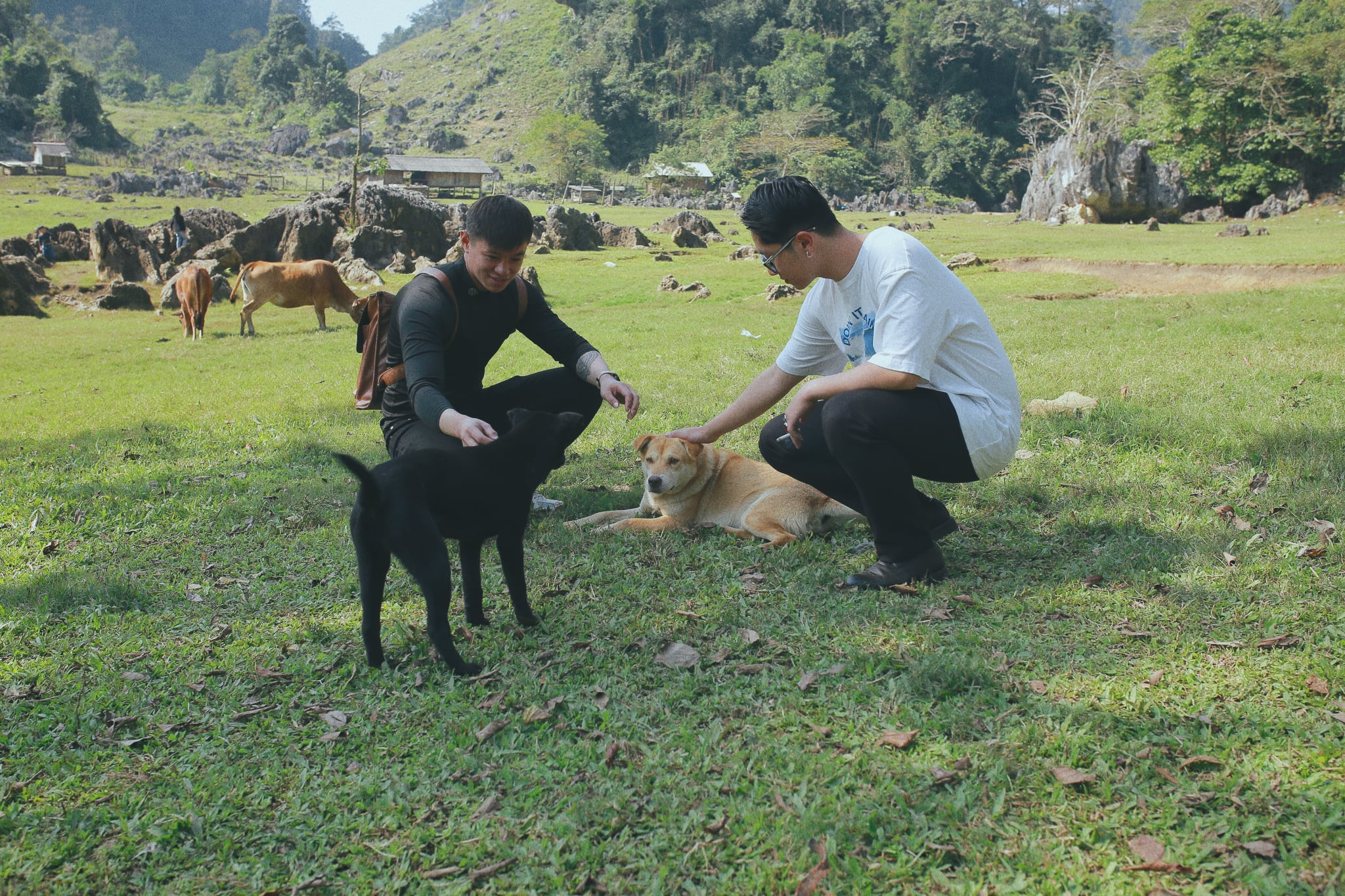 Hang Táu nằm cạnh bìa rừng, nổi bật là những nếp nhà gỗ, nhà sàn của người H’Mông nằm rải rác sát chân núi. Ở giữa làng là bãi cỏ rộng, bằng phẳng, thoải mái để đám trẻ chạy nhảy, vui chơi hay cho gia cầm, gia súc tự do tung tăng khắp nơi. Xung quanh là những cây cổ thụ cao lớn và các khối đá vôi nhấp nhô, tạo nên khung cảnh đầy hoang sơ, ấn tượng (Ảnh: Quang Kiên).