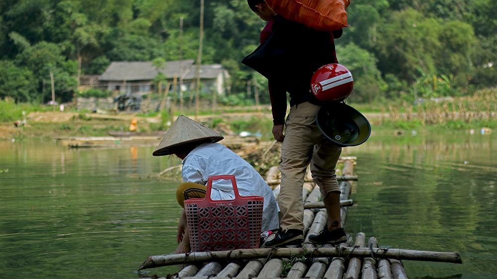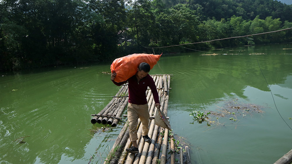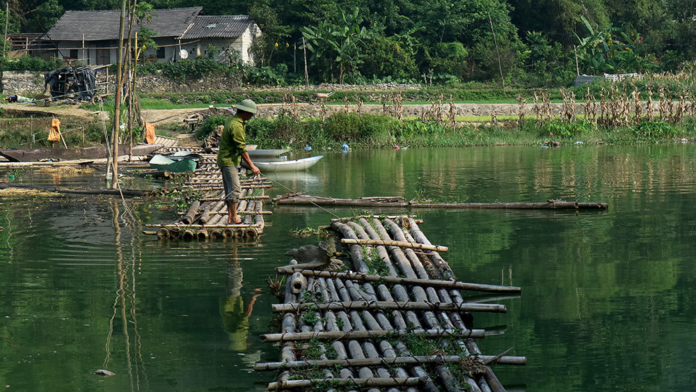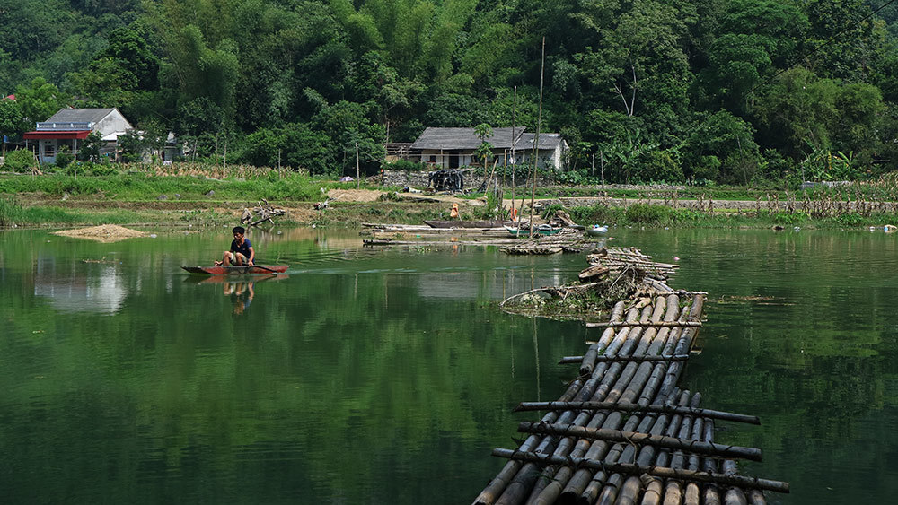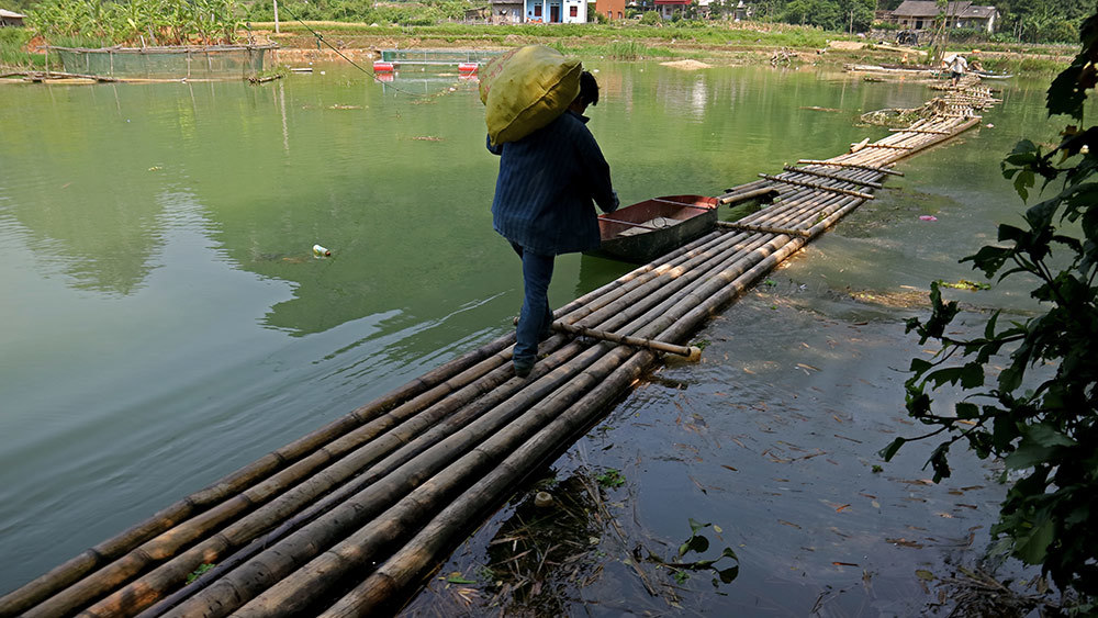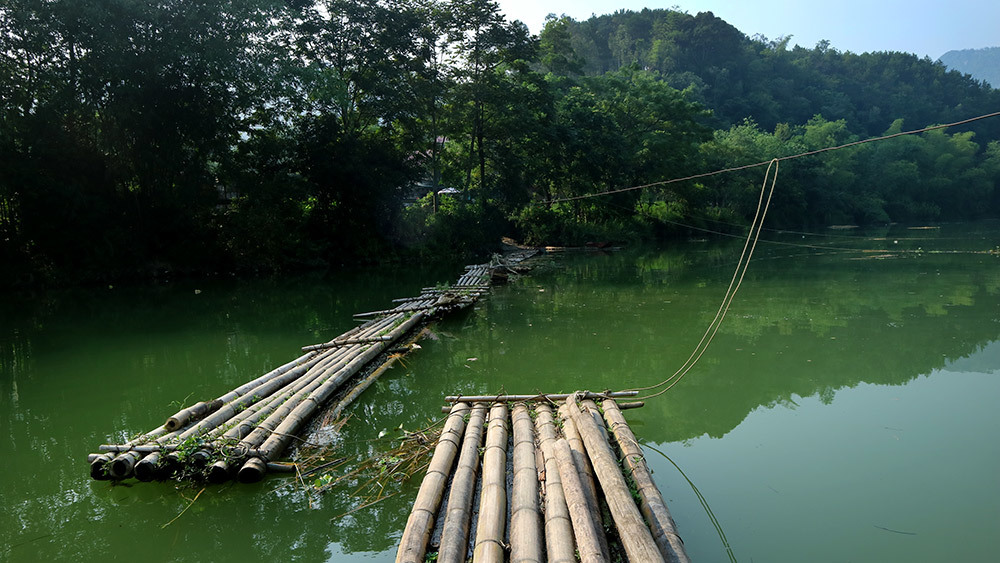 | Gần 10 năm nay, 20 hộ dân người Nùng ở thôn Nà Sáng nối những chiếc mảng tre giống như một chiếc cầu phao để đi lại thay cho kiểu chèo bè xưa kia. |