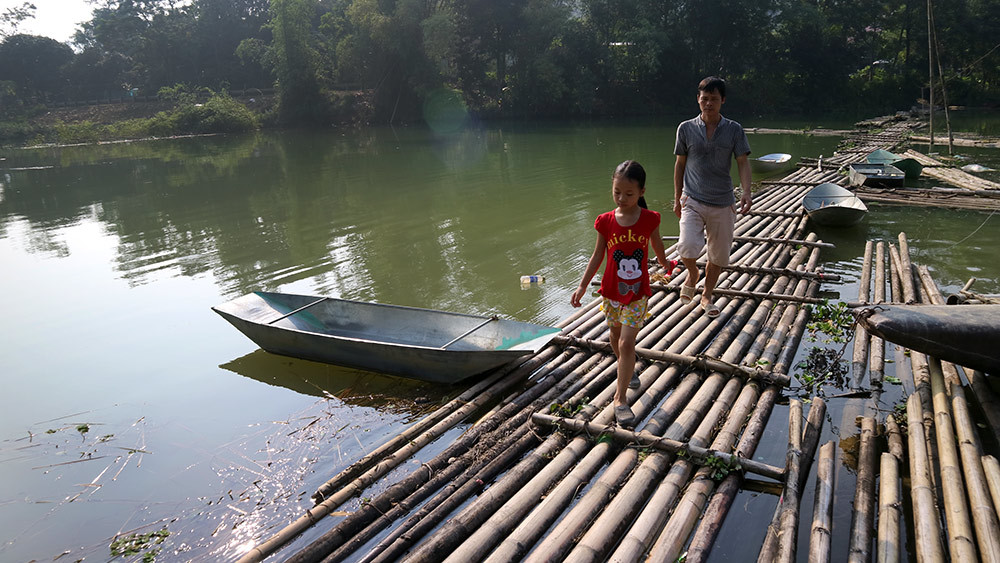 | Chiếc cầu bập bềnh, trôi dạt khiến việc qua lại khá nguy hiểm. Anh Nguyễn Quyến cũng như mọi người dân trong thôn luôn phải đi kèm trẻ em mỗi khi qua cầu. |