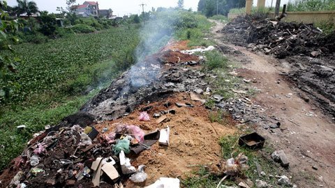 Người dân đi làm đồng phải bịt kín mặt chống bụi độc hại khi đi qua bãi chất thải tự phát này.